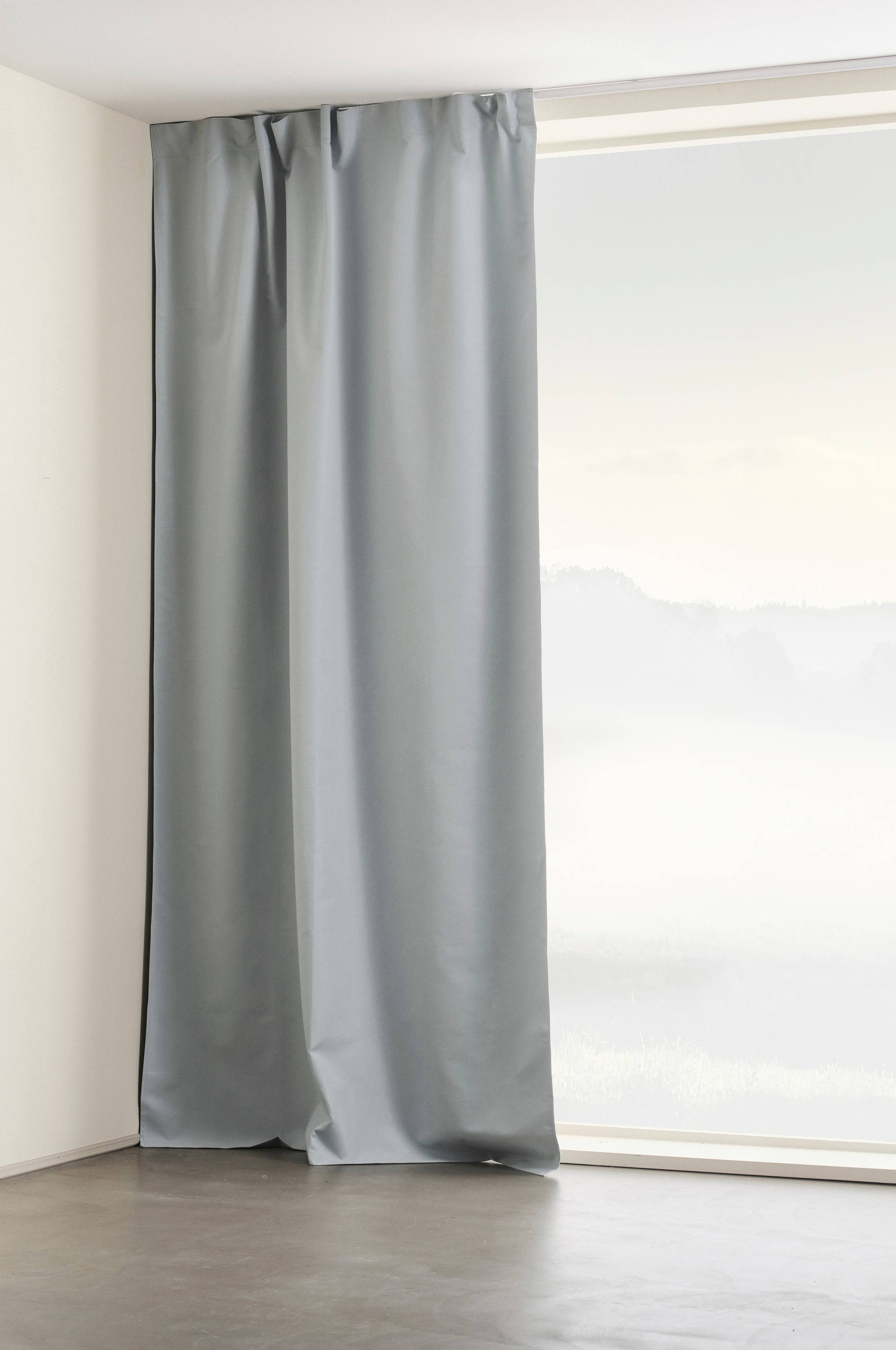 En gardinlängd för mörkläggning. NIKA är tillverkad av polyester i en mikrokvalitet som är extra smidig och följsam, samtidigt som ljuset ändå stängs ute av en mörkläggande beläggning. 50% är återvunnet material. Gardinen är lika fin på baksidan som på framsidan. Påsytt multifunktionsband. Gardinen kan hängas upp med fingerkrokar, kanal samt dold hälla.
