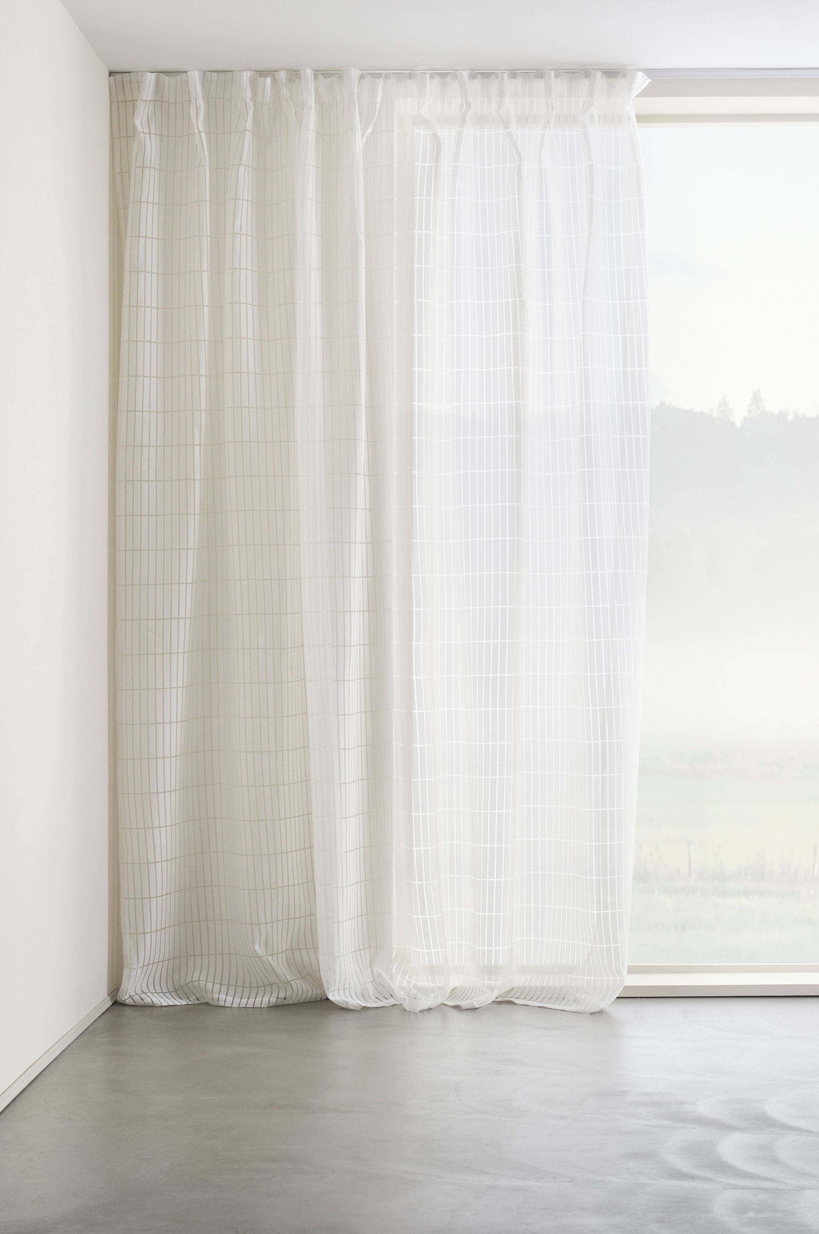 En extra bred gardinlängd i skir och luftig kvalitet av viskos och polyester med mönster som är delvis transparent, en så kallad burn out. Gardinen är tunn och får fint fall. Längden har påsytt multifunktionsband. Gardinen kan hängas upp med fingerkrokar, kanal samt dold hälla.