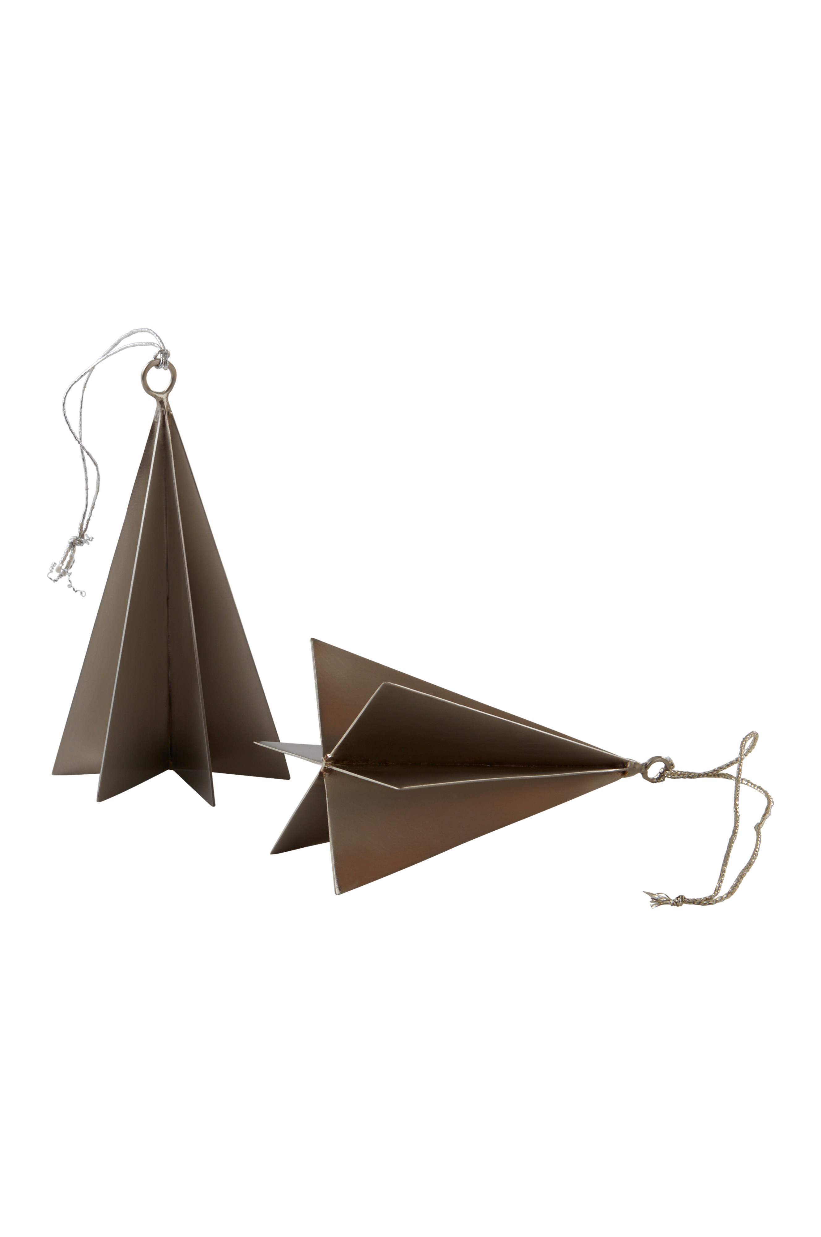 2-pack med dekorationer av stål. De stilistiska granarna har ögla och snöre upptill så du kan hänga dem i ett fönster, i julgranen eller där du vill dekorera lite extra.