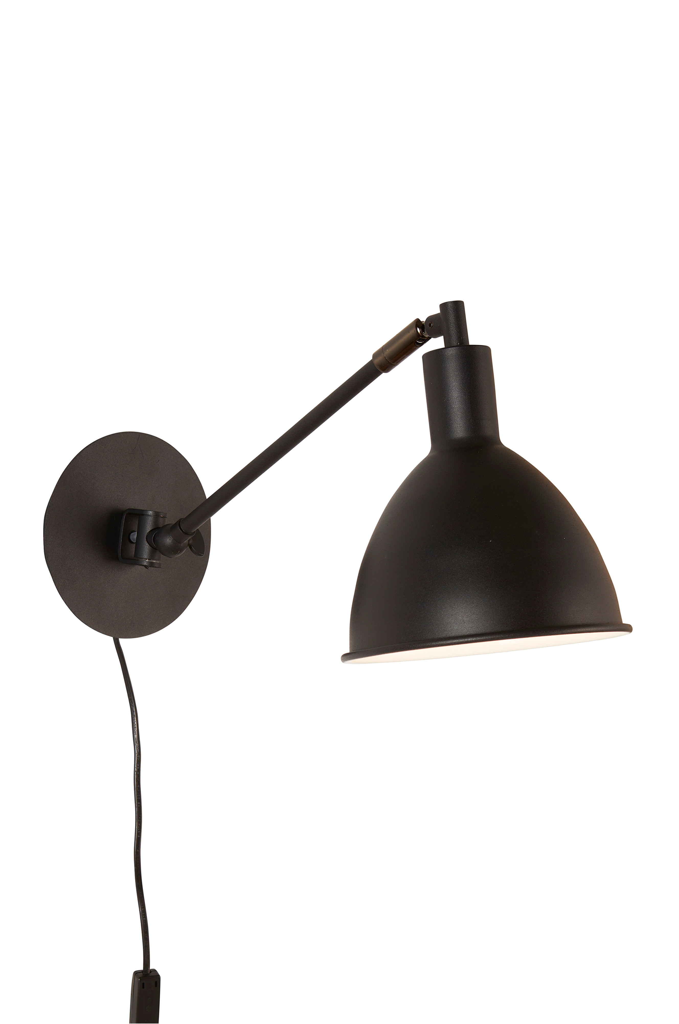 Vägglampa i metall med vridbar arm 360° och ställbar skärm. Sladd 1,5 m.