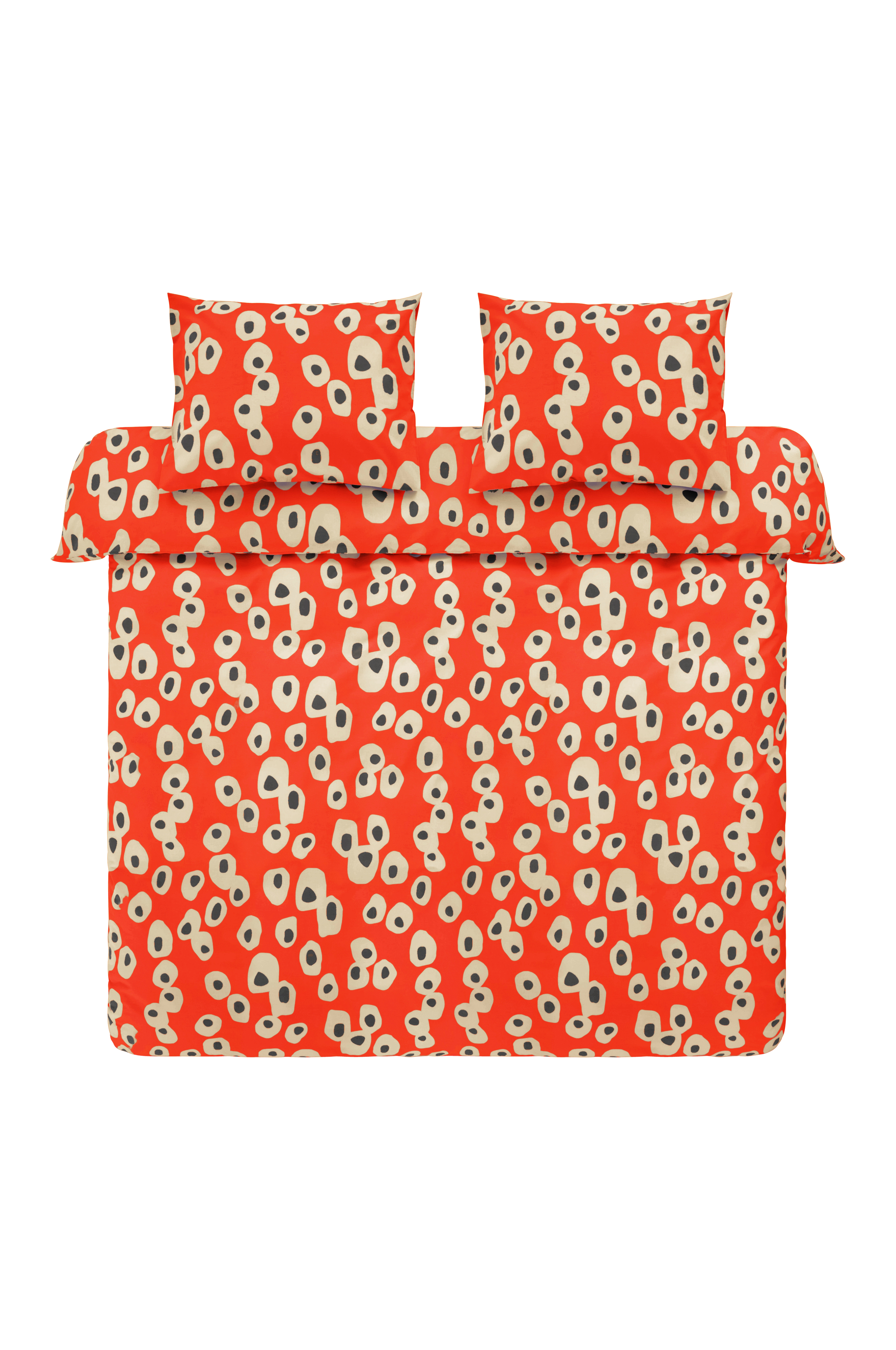 OVO dubbelsäng, med ett unikt mönster av Maria Carlberg, ger en lekfull retrokänsla till ditt sovrum med sin stekt ägg-inspirerade design. Detta set innehåller ett extra brett påslakan och två örngott, alla tillverkade av ekologisk bomull för komfort och kreativitet.