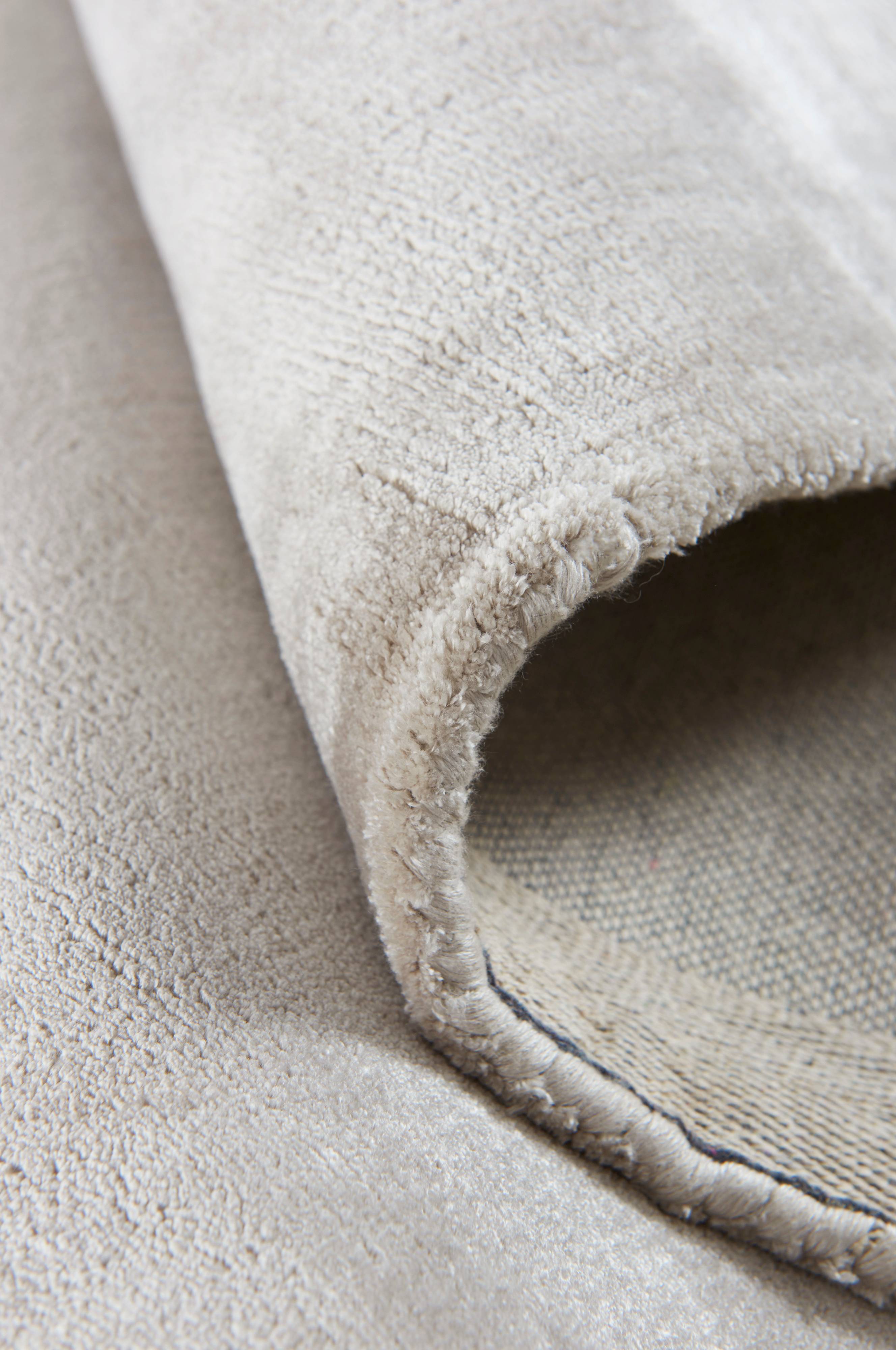 Handvävd viskosmatta som är enfärgad med otrolig glans och lyster som ger fina färgskiftningar. Mattan är mjuk och har en bred, luggfri bård med fransar längs kanten. Franslängd 10 cm. Lugghöjd 0,7 cm. 3500 gr/m². Baksida av bomull.