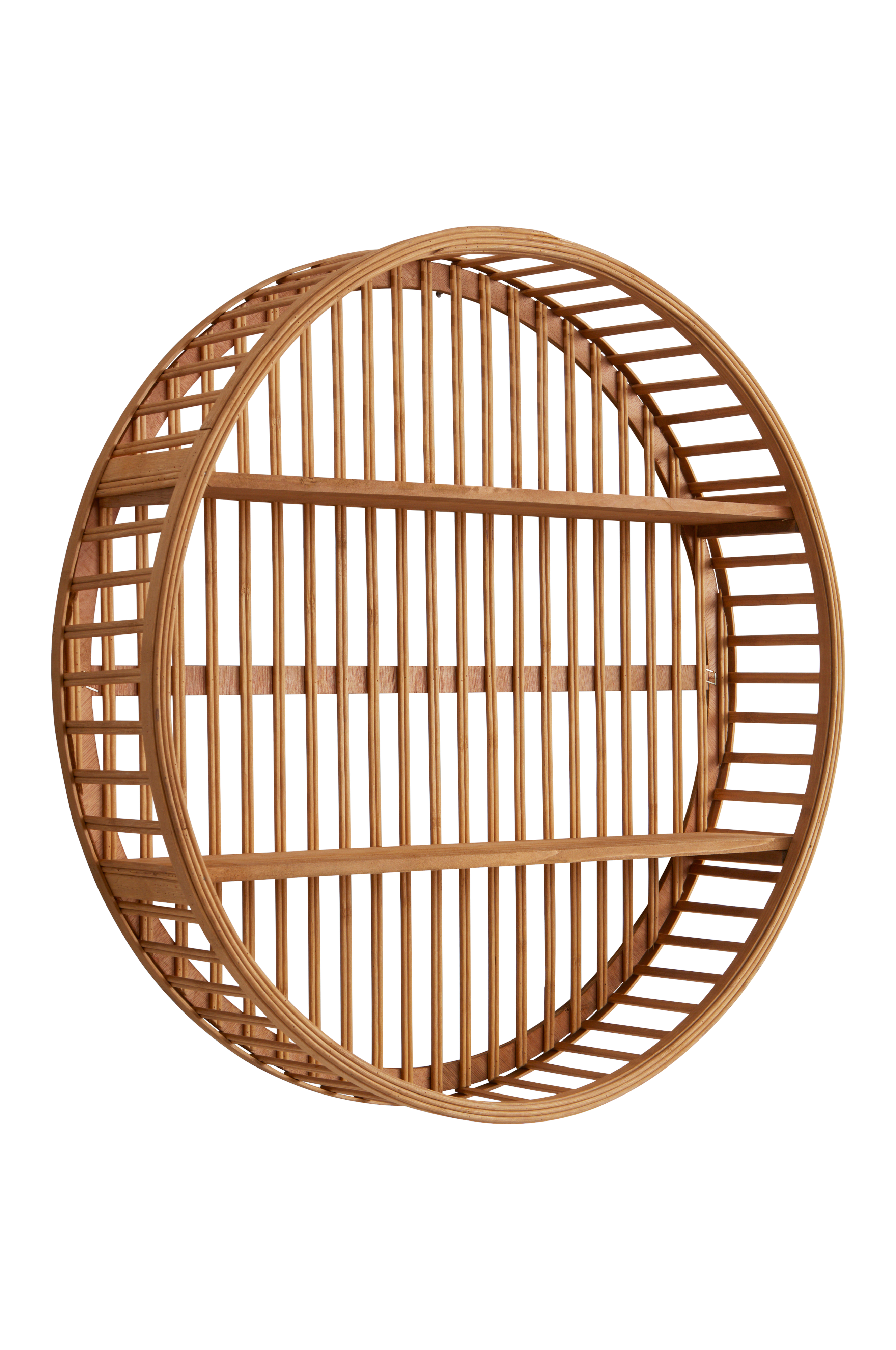 Rund vägghylla av bambu och ädelgran. Hyllplanen är i massivt trä. Den naturliga känslan förstärks av att hela hyllan är obehandlad. Två metallöglor på baksidan för upphängning på väggen.