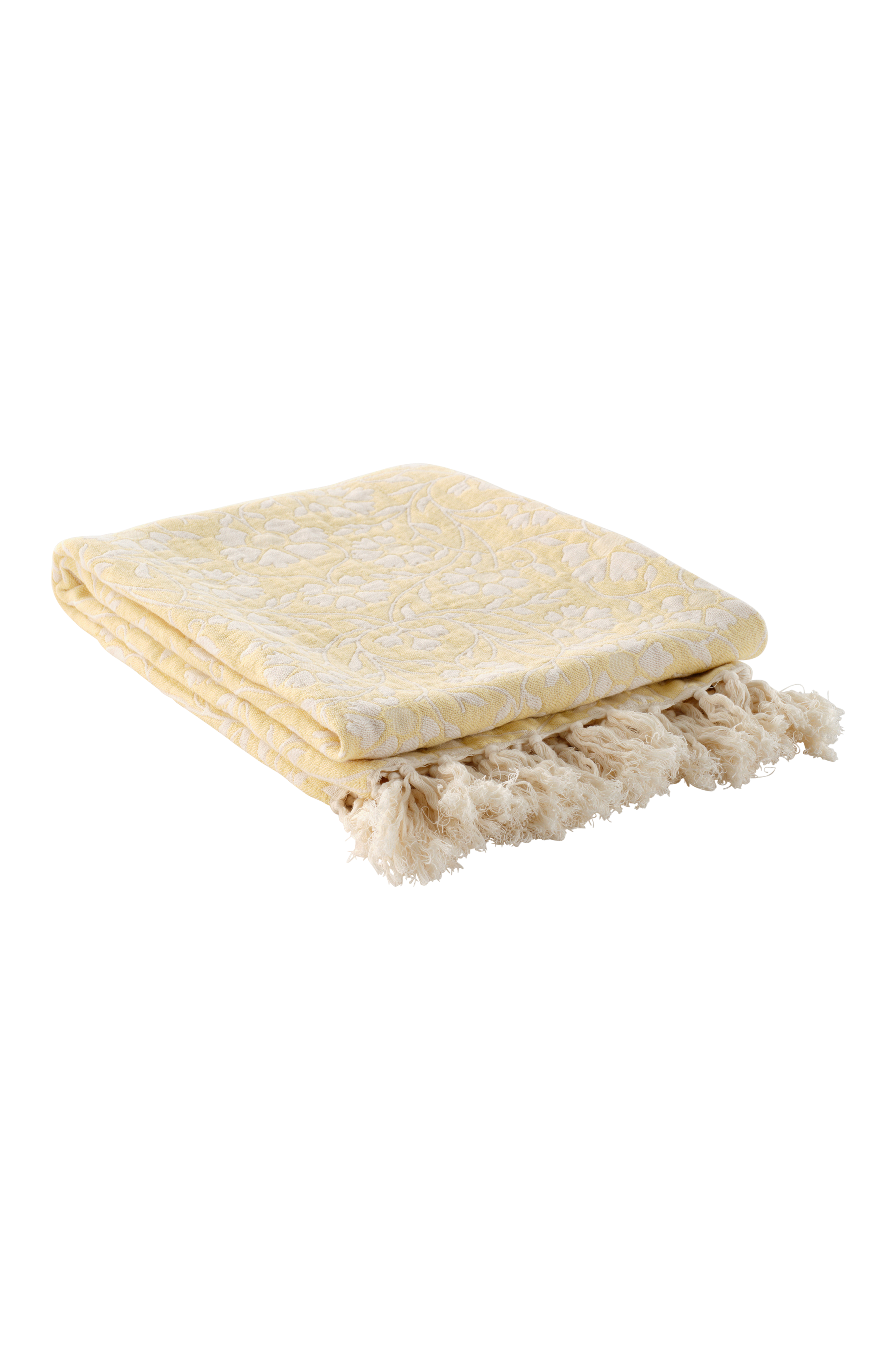 Jacquardvävd bomullspläd med intrikata blommönster och fransar utstrålar vintagecharm. Den är perfekt för att tillföra klassisk stil och mysig komfort till alla inredningar och är ett perfekt tillbehör till ditt vardagsrum eller sovrum.