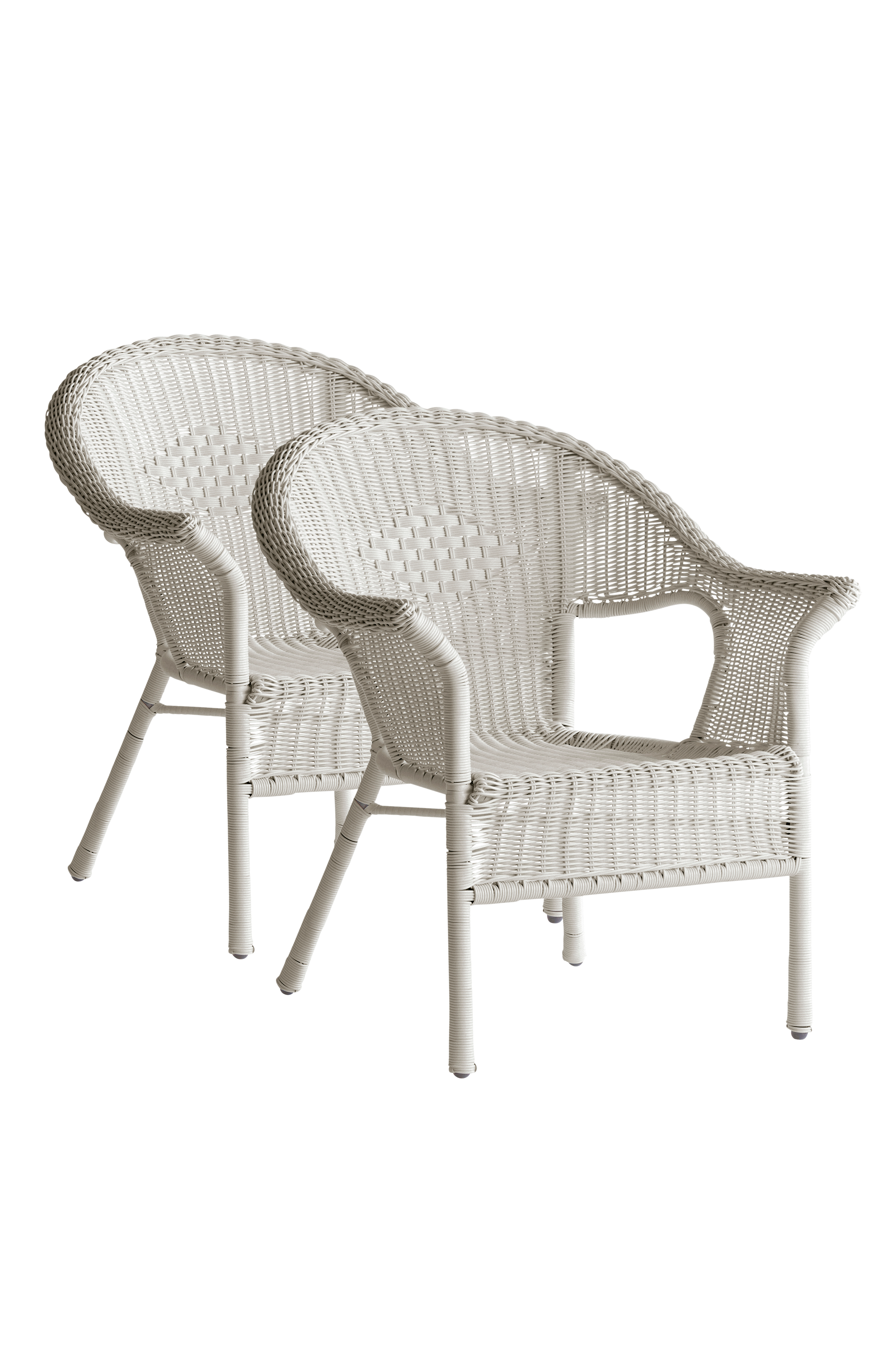 2-pack karmstolar i charmig modell med lantlig stil. De klassiska korgstolarna är alltid lika populära och ger en skön retrokänsla. PROVENCE är tillverkad i aluminium och tålig konstrotting så du kan ha den utomhus och den kräver minimalt med underhåll, praktiskt och bra. Fåtöljen passar fint både som solitär och tillsammans med flera runt ett bord. Stolarna är dessutom stapelbara.