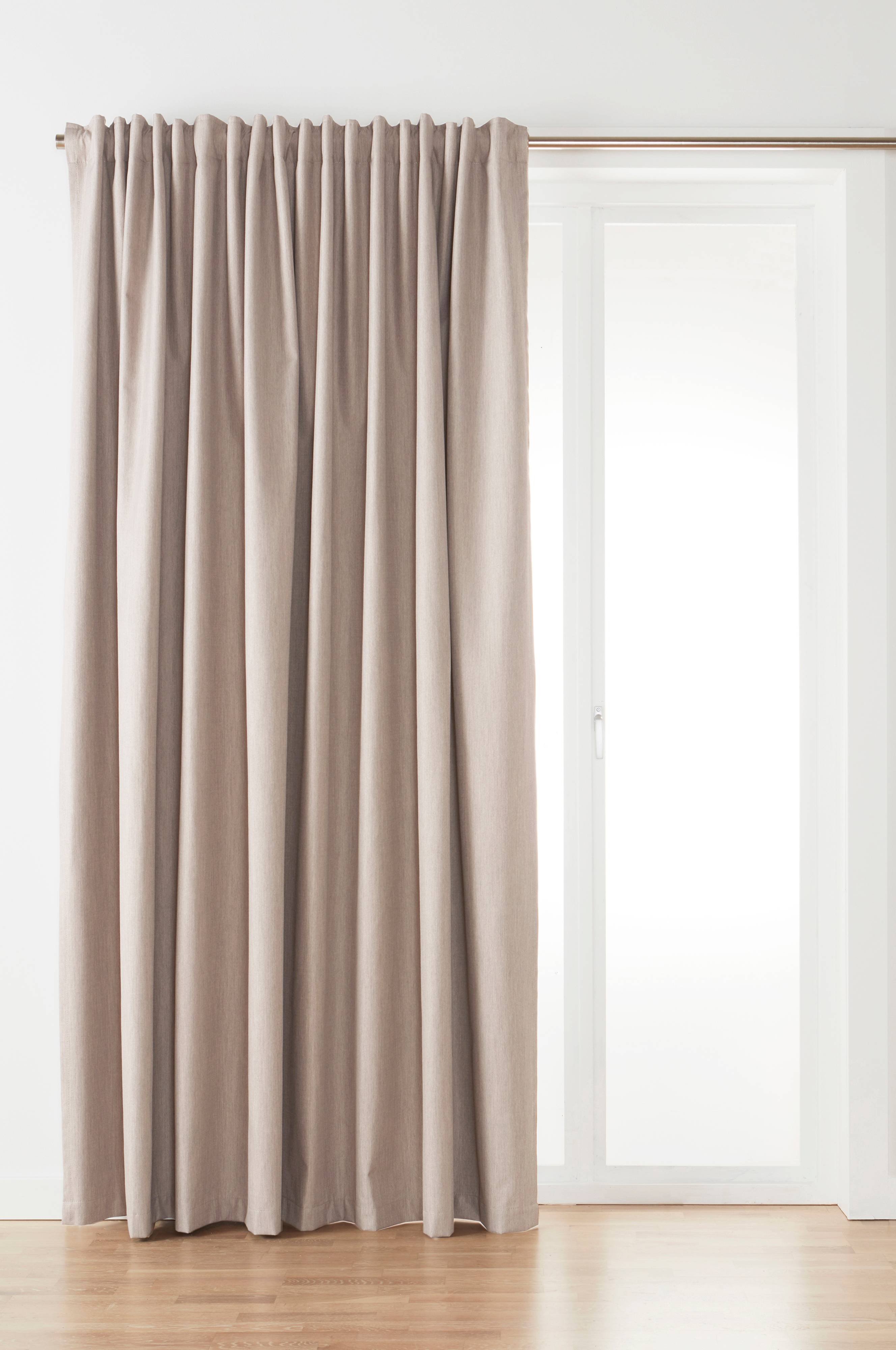 En gardinlängd i polyester med påsytt multifunktionsband och mörkläggande baksida. Stäng ute ljuset när du vill. Mörkläggningsgardinen har struktur, matt yta och samtidigt lyster i trådarna vilket skapar en unik känsla i rummet. Multifunktionsbandet ger dig möjligheten att variera din upphängning med rynkband, dold hälla eller veckband.