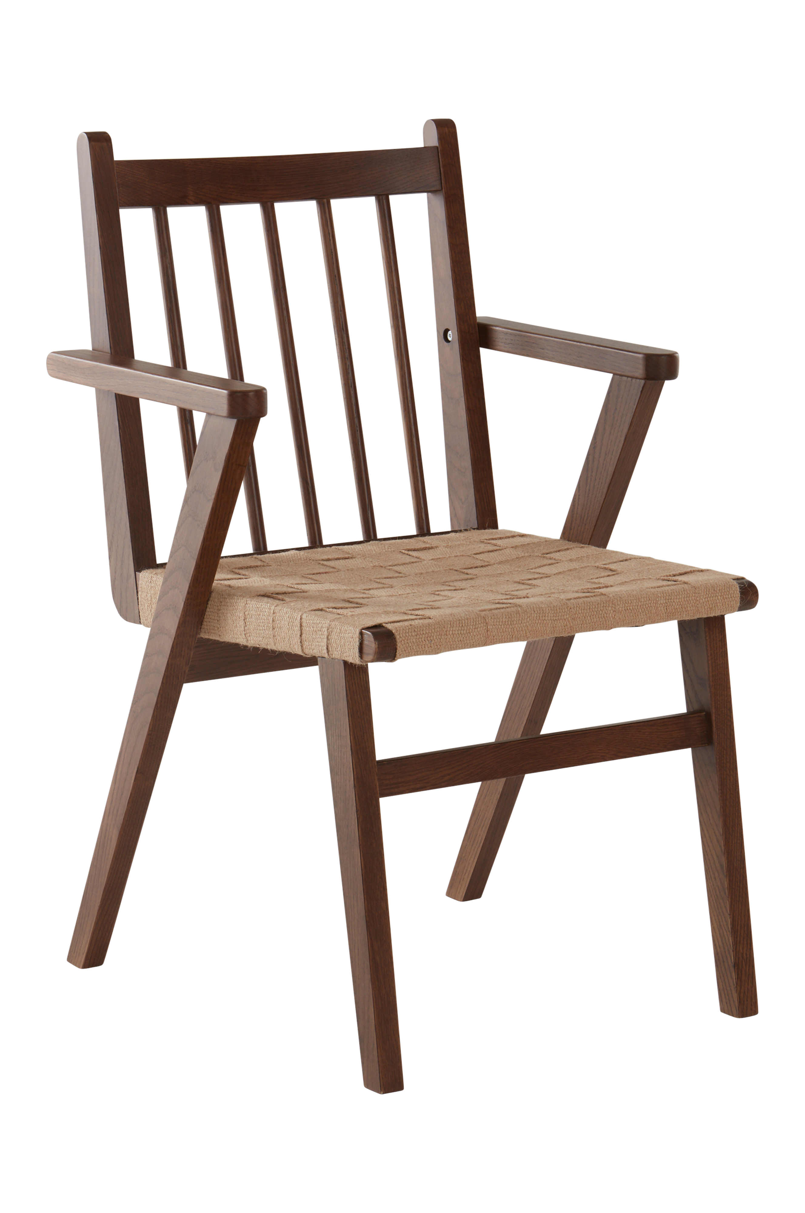 Karmstol av FSC-certifierad ek med flätad sits, sadelgjord av jute. Stolen har försetts med textil under sitsen så att sitsen behåller formen. Stolen är i snygg design med rena linjer i klassisk stil. Eken är målad med vattenbaserad färg i snygg brun kulör.