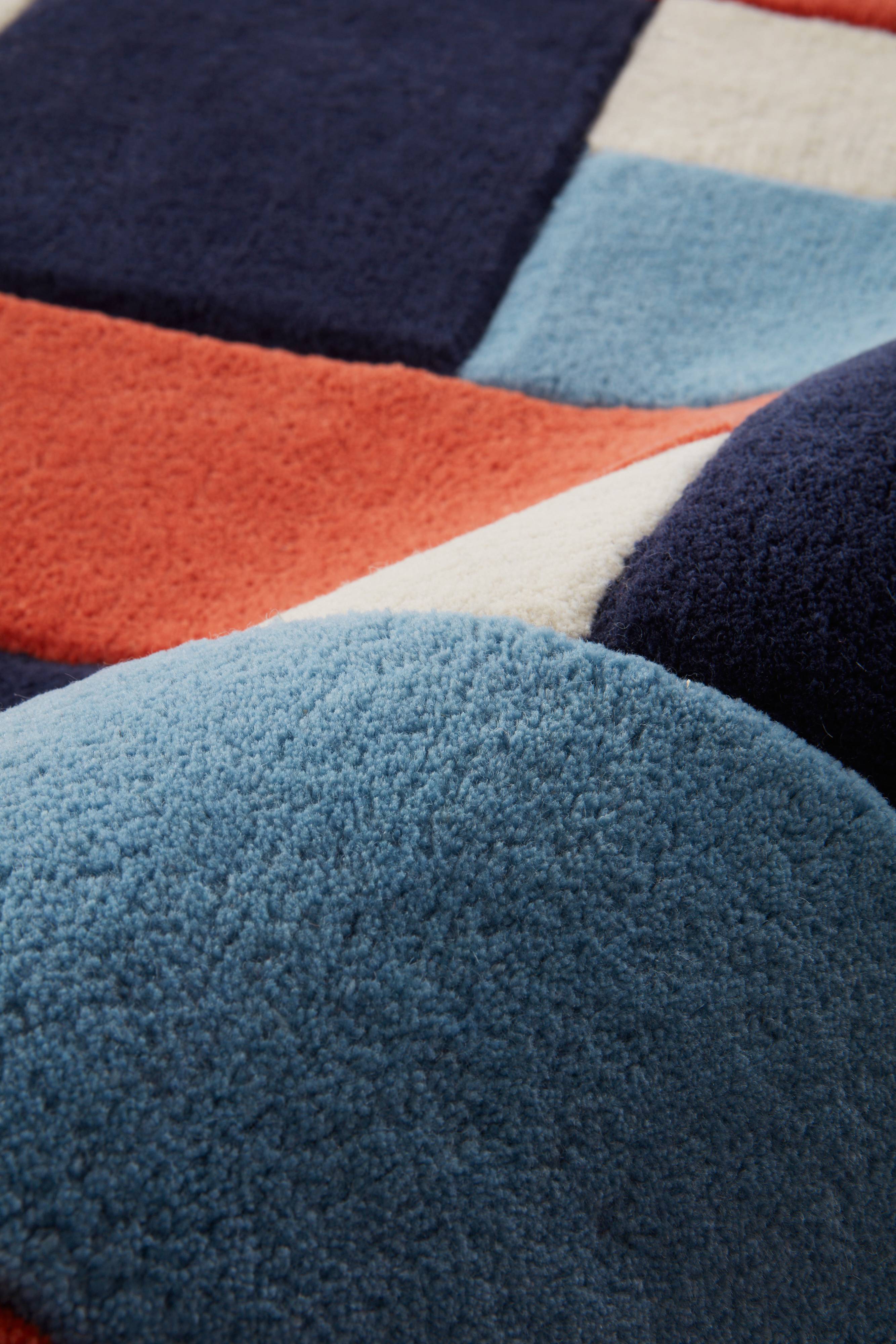 Handtuftad ullmatta med kontrastrikt rutmönster som ger illusionen av flätade band i olika färger. Mattan har kort, tät ull som är mjuk och varm att gå på. Ull ger en naturligt varm och praktiskt smutsavvisande matta. Lugghöjd 0,8-1 cm. Tjocklek 1,6 to 2,5 cm. 3500-3700 g/m².