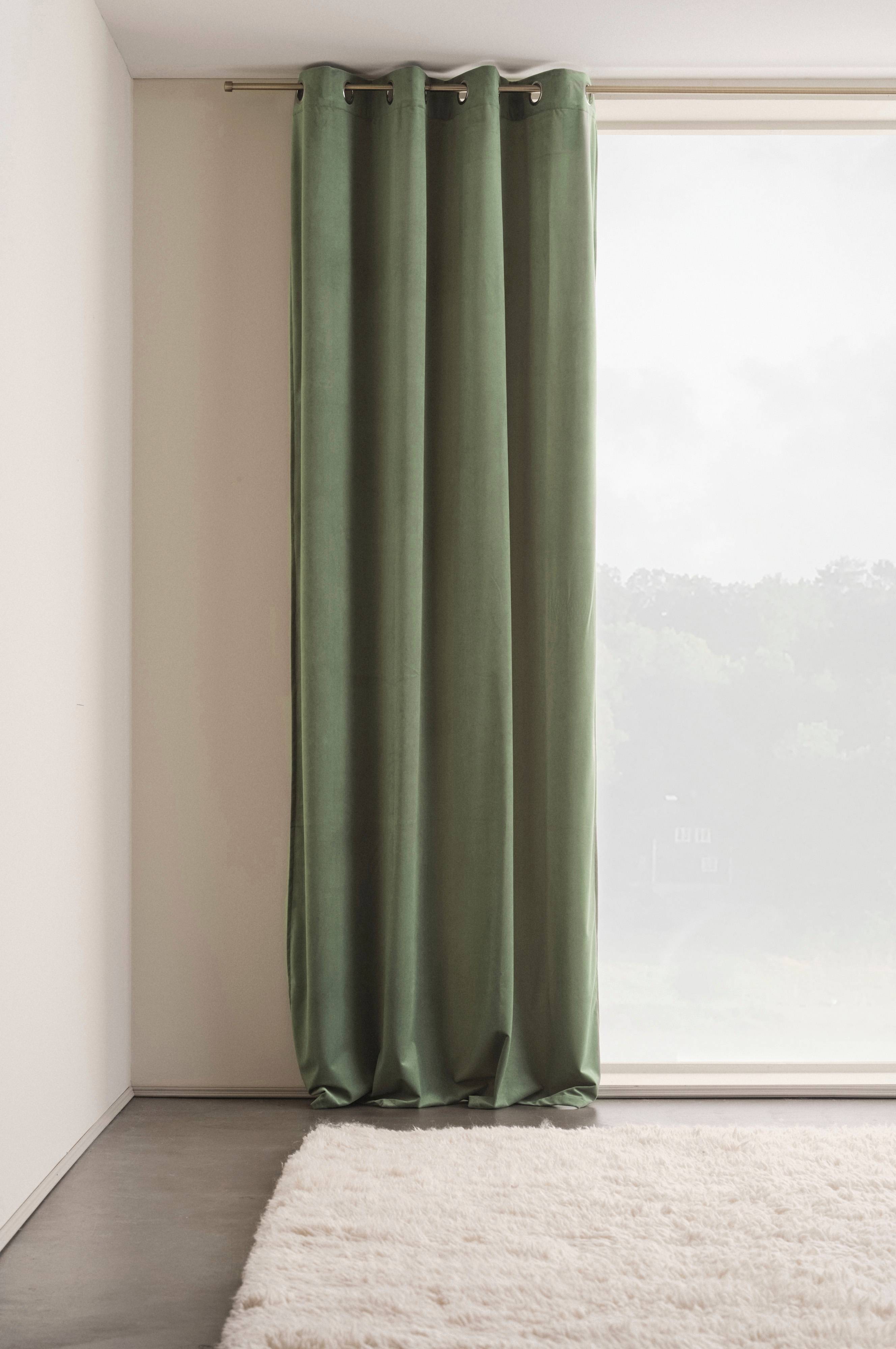 En öljettlängd i enfärgad sammet av polyester. 8 st öljetter per längd. Sammet har fin lyster och mjuk känsla, färgen skimrar vackert i olika ljus.