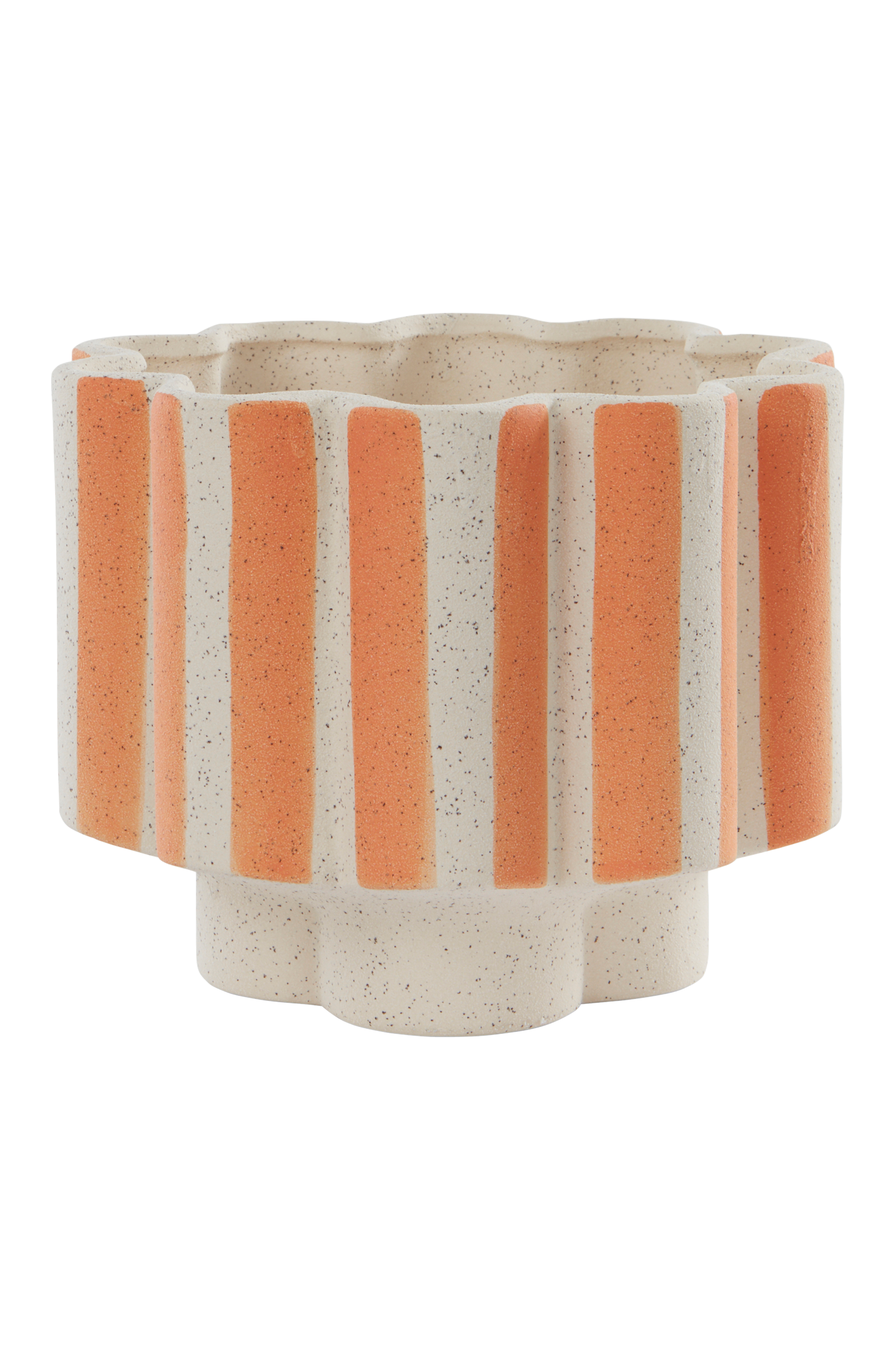 Randig kruka av keramik. Formen är som en blomma och den har fot i mitten som gör att den kommer upp några centimeter från underlaget. Krukan har naturvit stenfinish med ljusblå ränder. Krukan har glaserats för hand. Även insidan är glaserad. Det fina hantverket gör varje kruka unik. Keramik kan släppa igenom fukt.