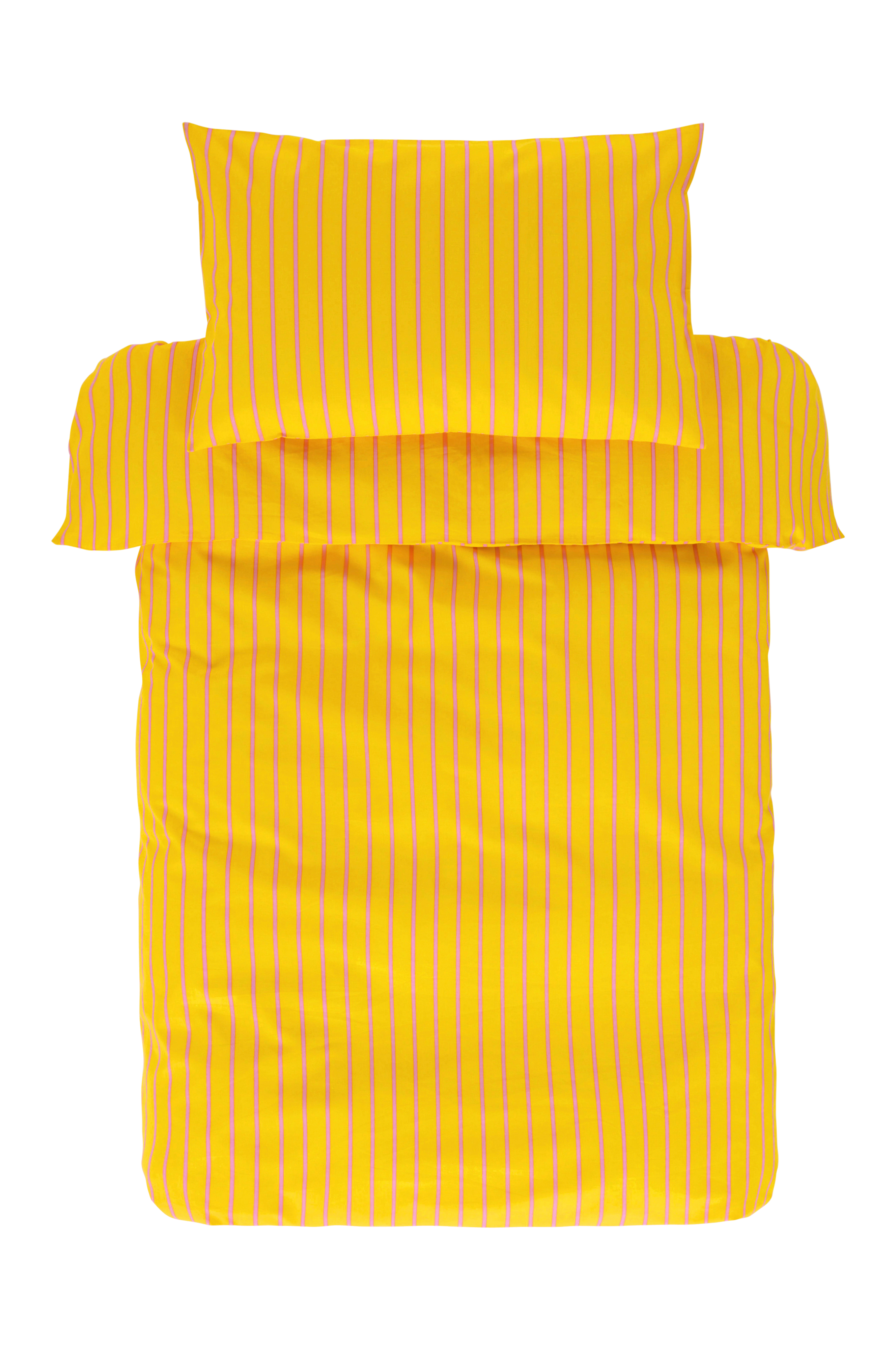 SIMA påslakan i ekologisk bomull som är skräddarsytt för att passa spjälsängen och ge en mjuk känsla för ditt barns vilsamma sömn. Tryckta ränder i krispiga färger.