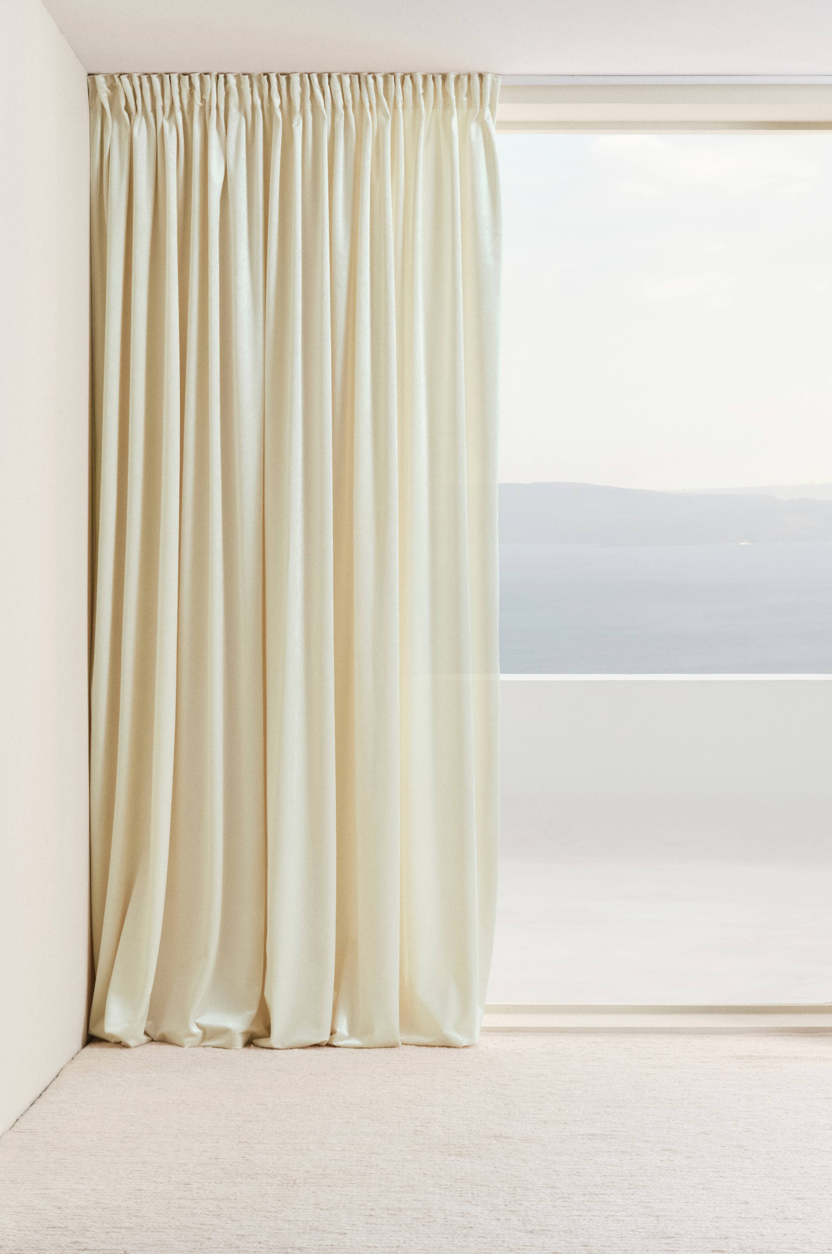 En gardinlängd i elegant sammet av polyester. Sammetstyget skimrar vackert, färgnyansen upplevs olika beroende på hur ljuset faller. Längden har påsytt multifunktionsband. Gardinen kan hängas upp med fingerkrokar, kanal samt dold hälla.