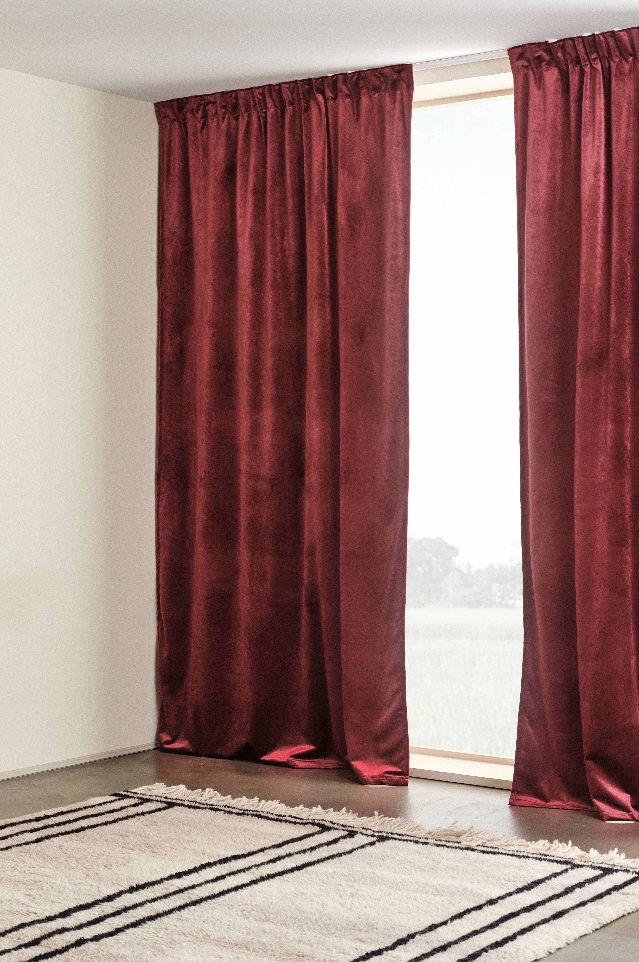 Två gardinlängder i elegant sammet av polyester. Sammetstyget skimrar vackert, färgnyansen upplevs olika beroende på hur ljuset faller. Längden har påsytt multifunktionsband. Gardinen kan hängas upp med fingerkrokar, kanal samt dold hälla.