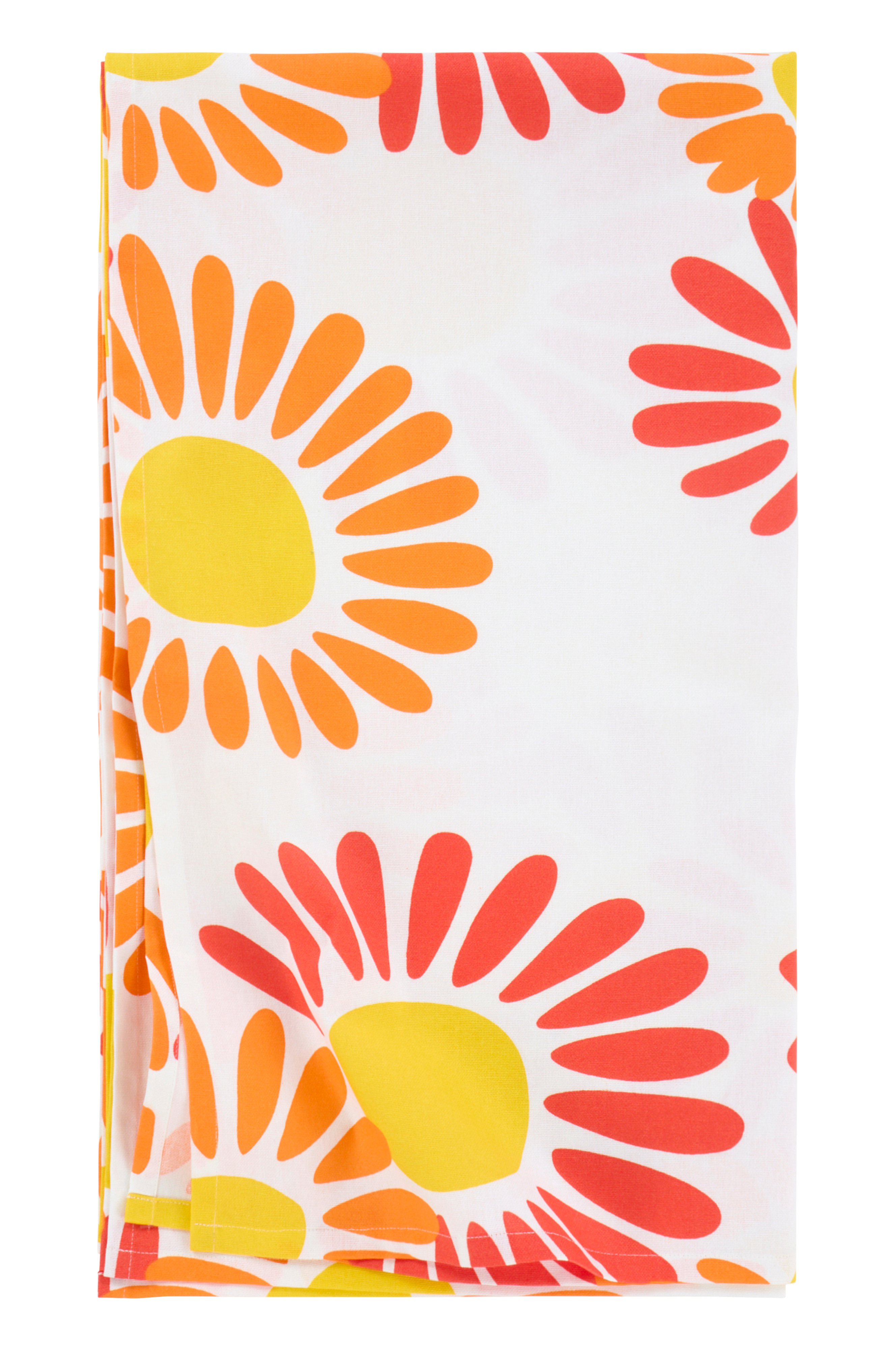 Den solrosmönstrade bordsduken på vit botten ger liv åt alla miljöer med sina röda, orangea och gula färger. Den är lämplig för inomhus- och utomhusbruk och förhöjer trädgårdsfester och vardagliga sammankomster, och har en vattenavvisande yta för bekvämlighet och stil.