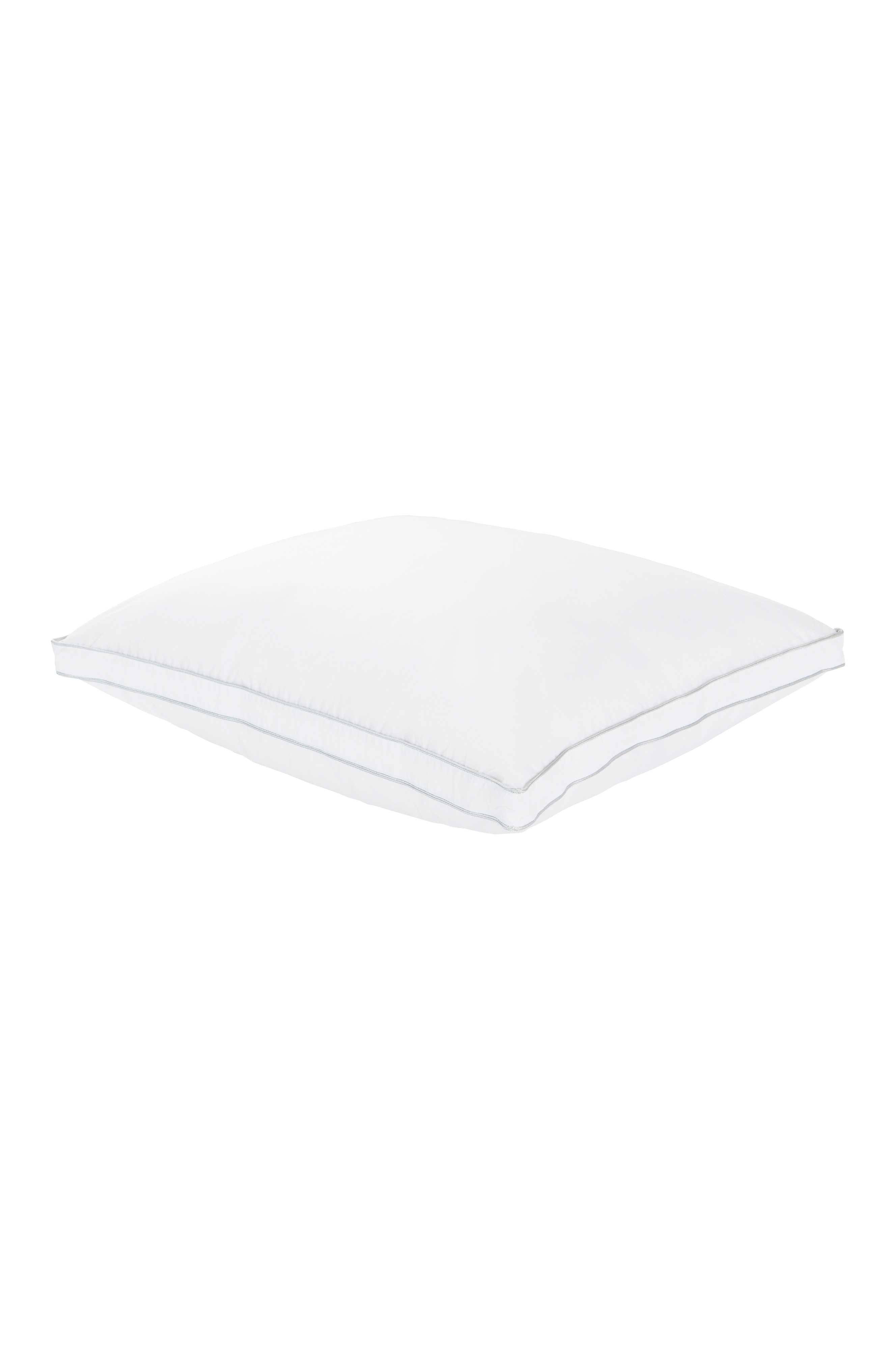 Det vita yttertyget är av tät bomull som inte läcker dun och har två silvergrå passpoalkanter runt om. Dunkudden levereras i en tygväska av bomull. .