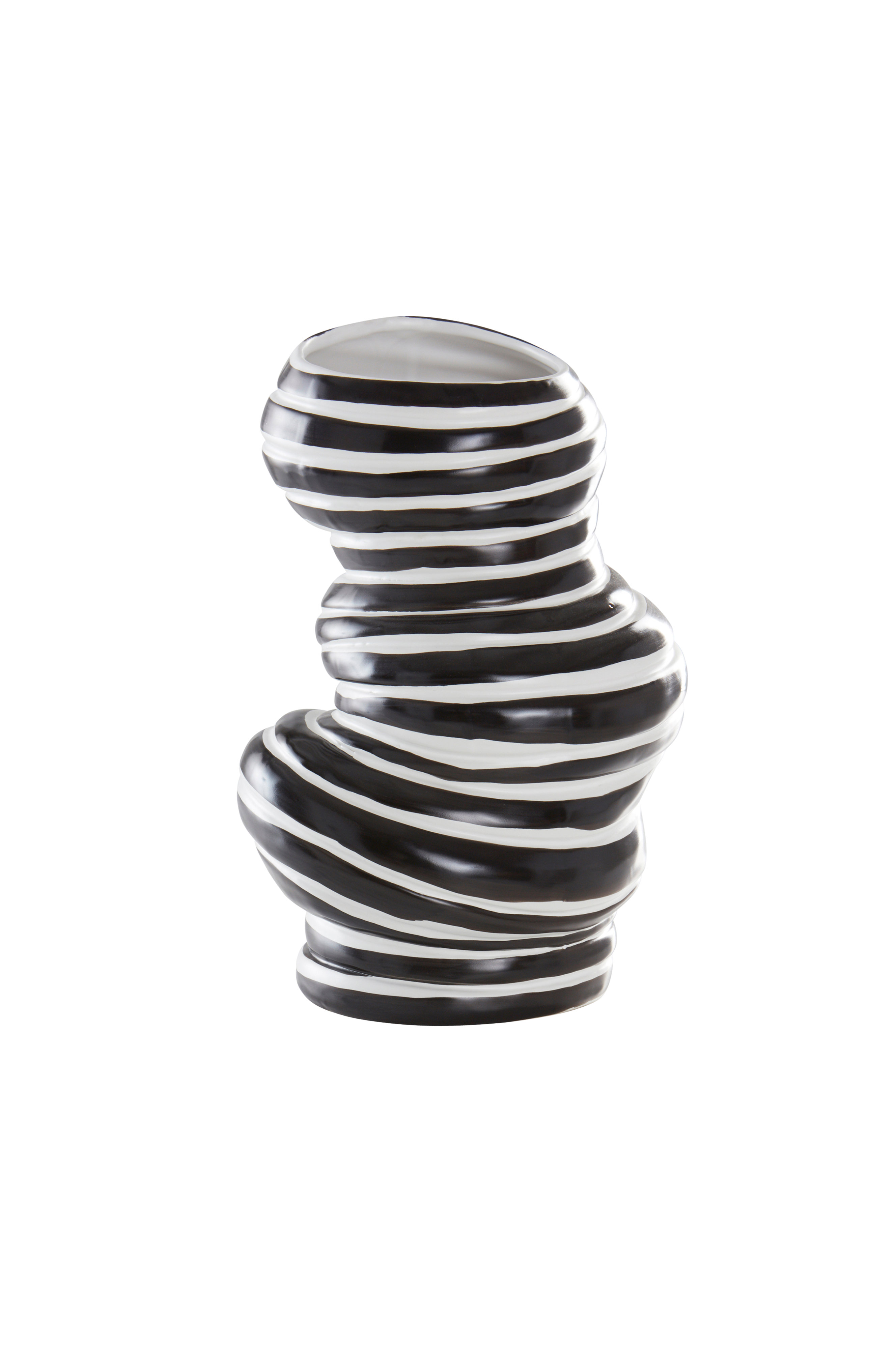 Dekorationsvas av keramik. Vasen är handgjord och har en oregelbunden form och ett dekorativt randigt mönster. Även insidan är glaserad. Viss avvikelse kan förekomma eftersom vasen är handgjord. Keramik kan släppa igenom fukt.