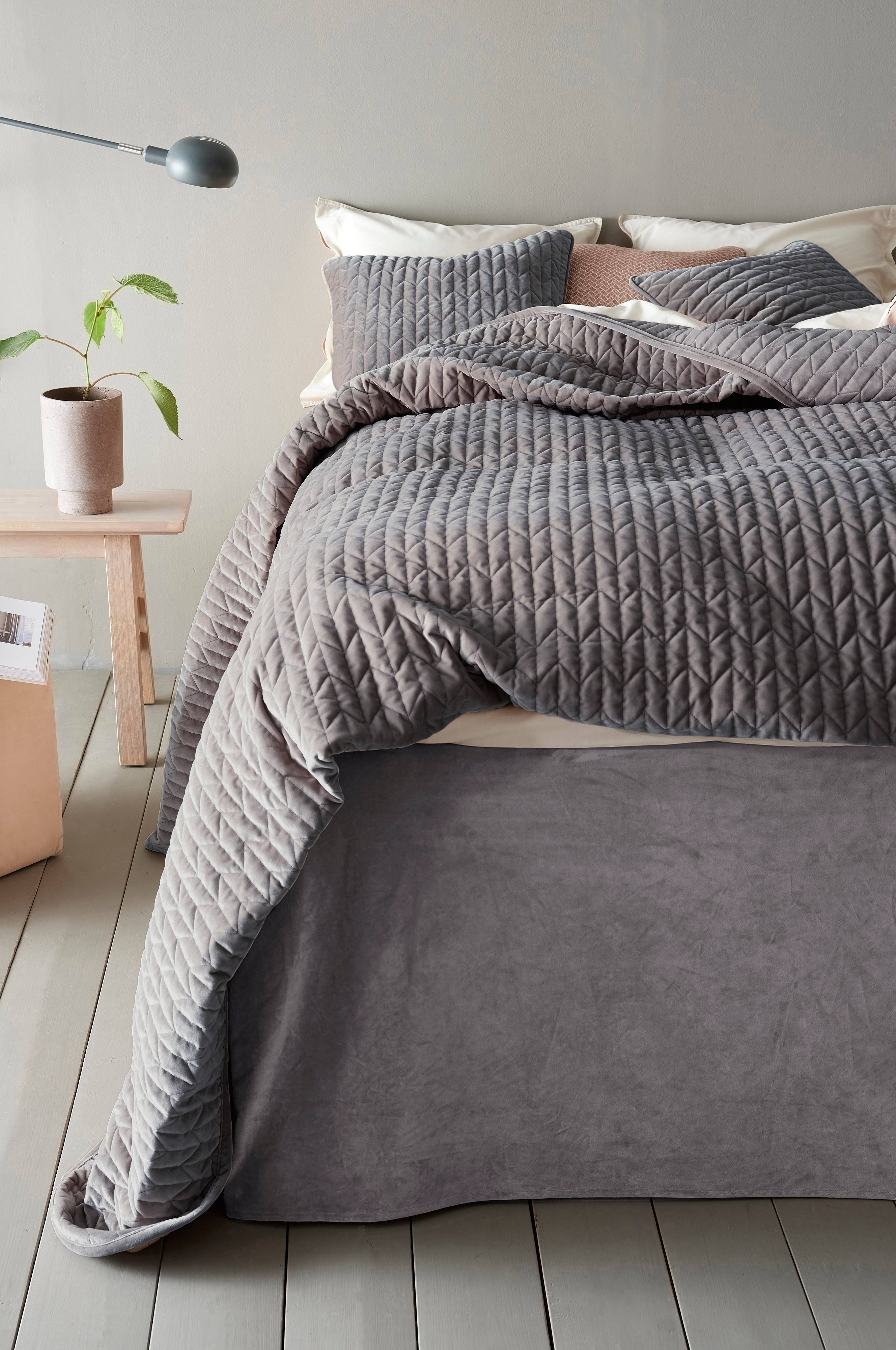 Bäddpaket med överkast i quiltad sammet med dekorativa sömmar och piping runt om.