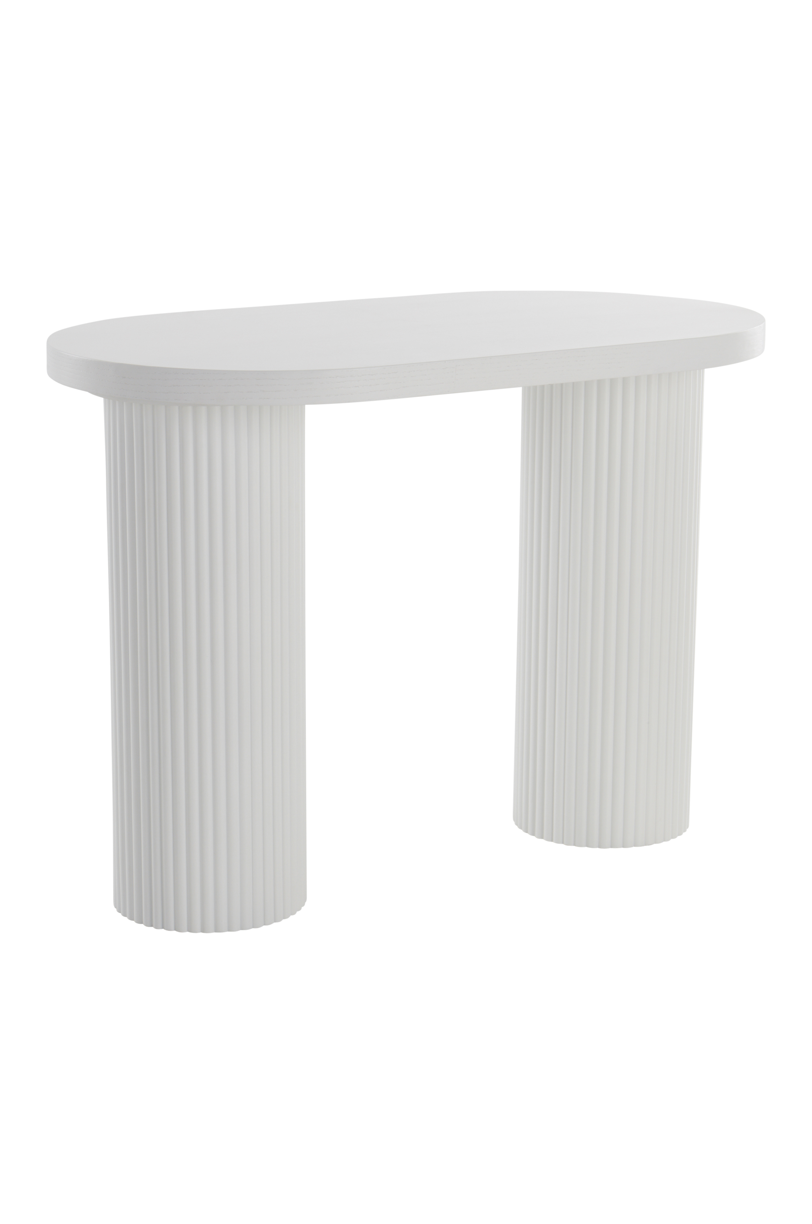Skrivbord i behändig och gedigen modell. Skrivbordet är av MDF med faner av ask eller valnöt. Skrivbordet har ovalt formad bordsskiva som är kraftig och har fin ådring. De runda, omfångsrika benen har strukturränder som ger ett välarbetat intryck. Skrivbordet bör förankras i väggen, väggfäste medföljer. Skrivbordet är litet och lättplacerat, det passar lika bra som hemmakontor i vardagsrummet som till läxorna i barnrummet. Viss montering krävs. Monteringsanvisning medföljer.