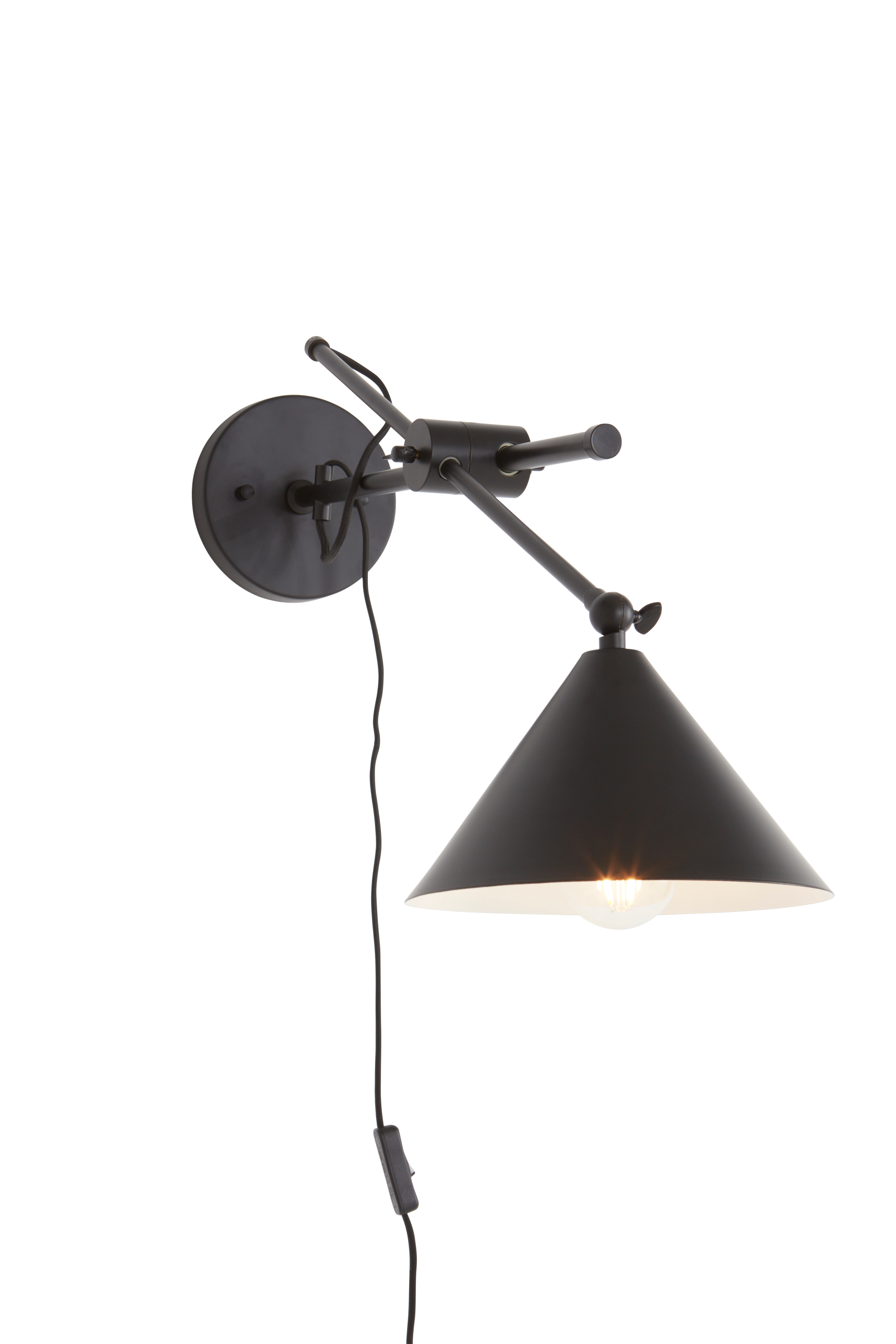 Vägglampa i metall med ställbar arm och skärm. En modern och kaxig vägglampa med tvinnad textilkabel som ger lyxig känsla. Sladdlängd 25/150 cm. Glödlampa medföljer ej.