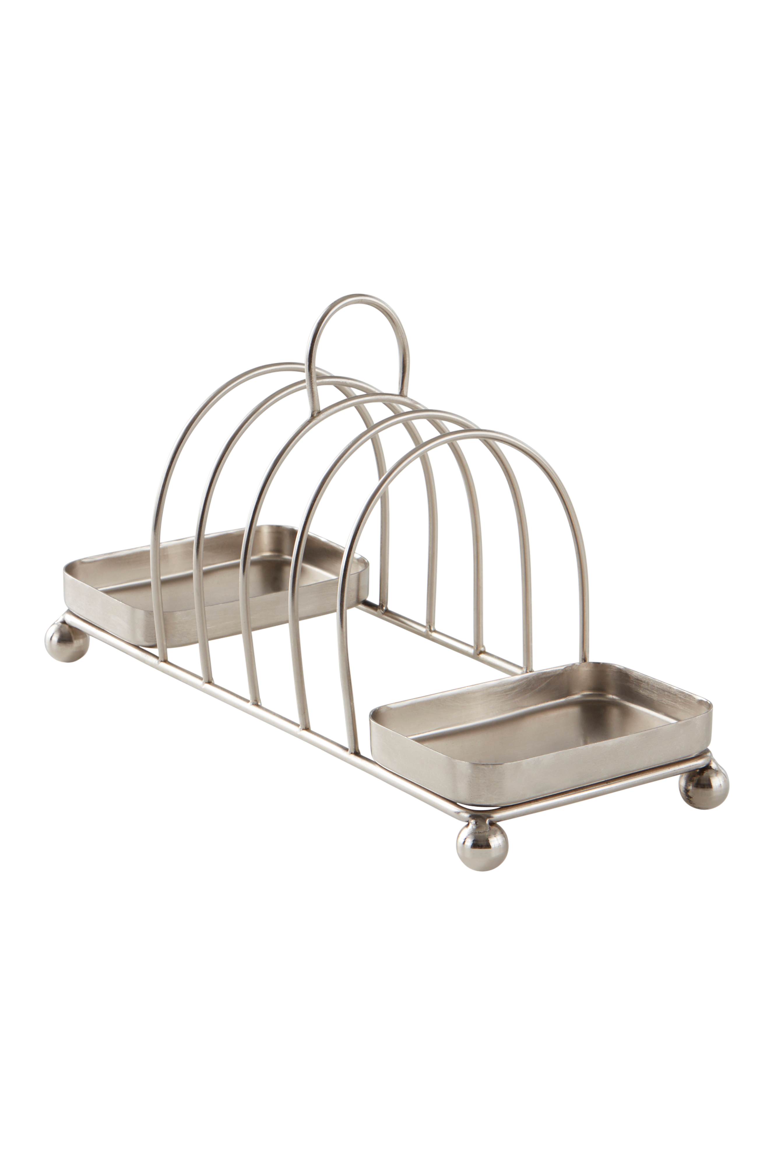Brödställ av stål med borstad yta. Brödstället rymmer fyra rostade skivor och i vardera änden finns en liten fyrkantig skål för marmelad och smör eller något annat gott. Frukostdukningen får en härligt brittisk känsla. Runda små tassar gör att brödet kommer upp lite från bordet. Med ringen på toppen lyfter du lätt brödskivorna för att bjuda övriga runt bordet.