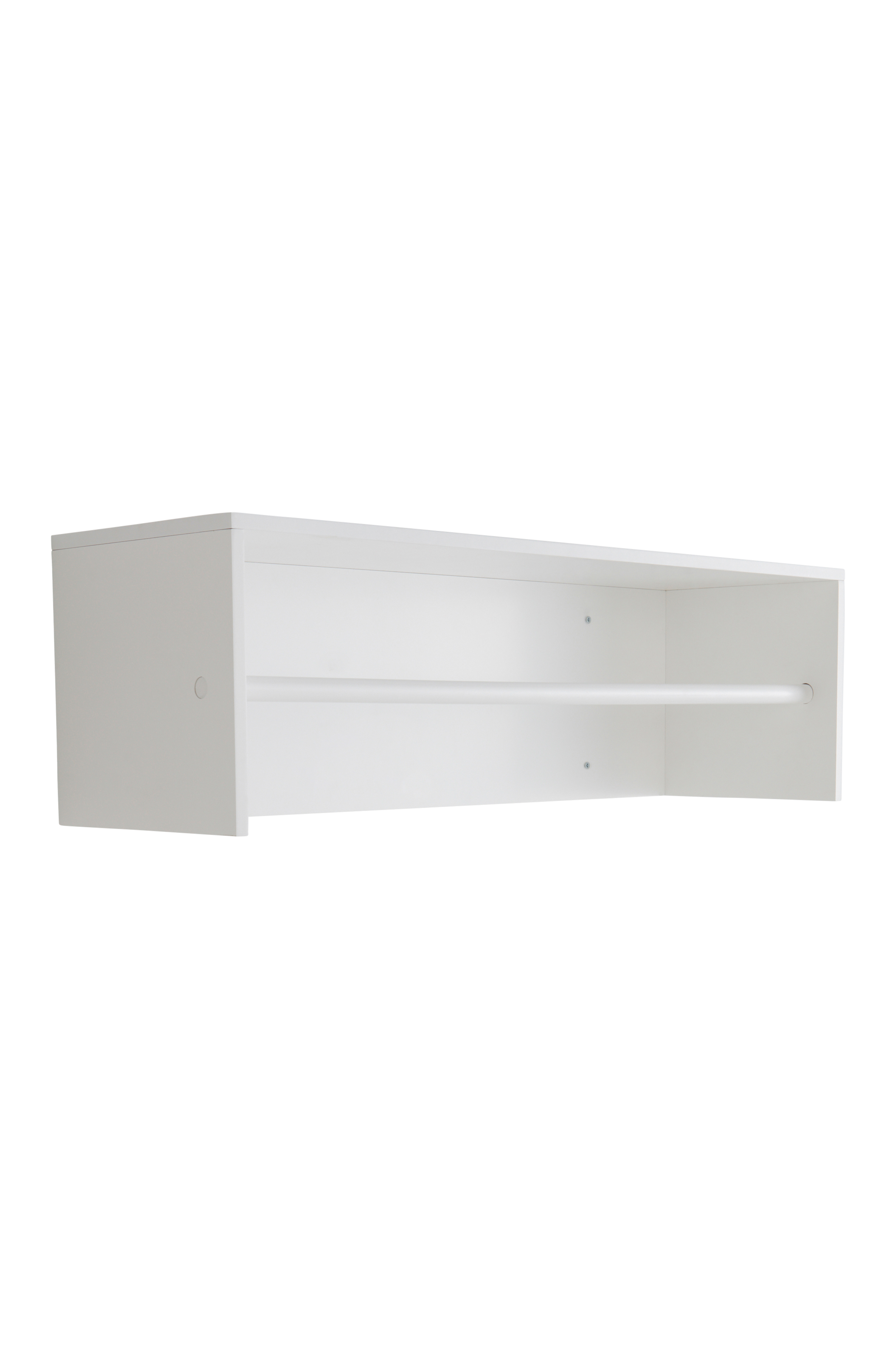 Hatthylla med klädstång, tillverkad i MDF och massivt gummiträ, som målats med vattenbaserad färg. Hatthyllan monteras på väggen i den höjd du önskar och den har en klädstång för galgar till ytterkläder. Galgar medföljer ej. Viss montering krävs. Monteringsanvisning medföljer.
