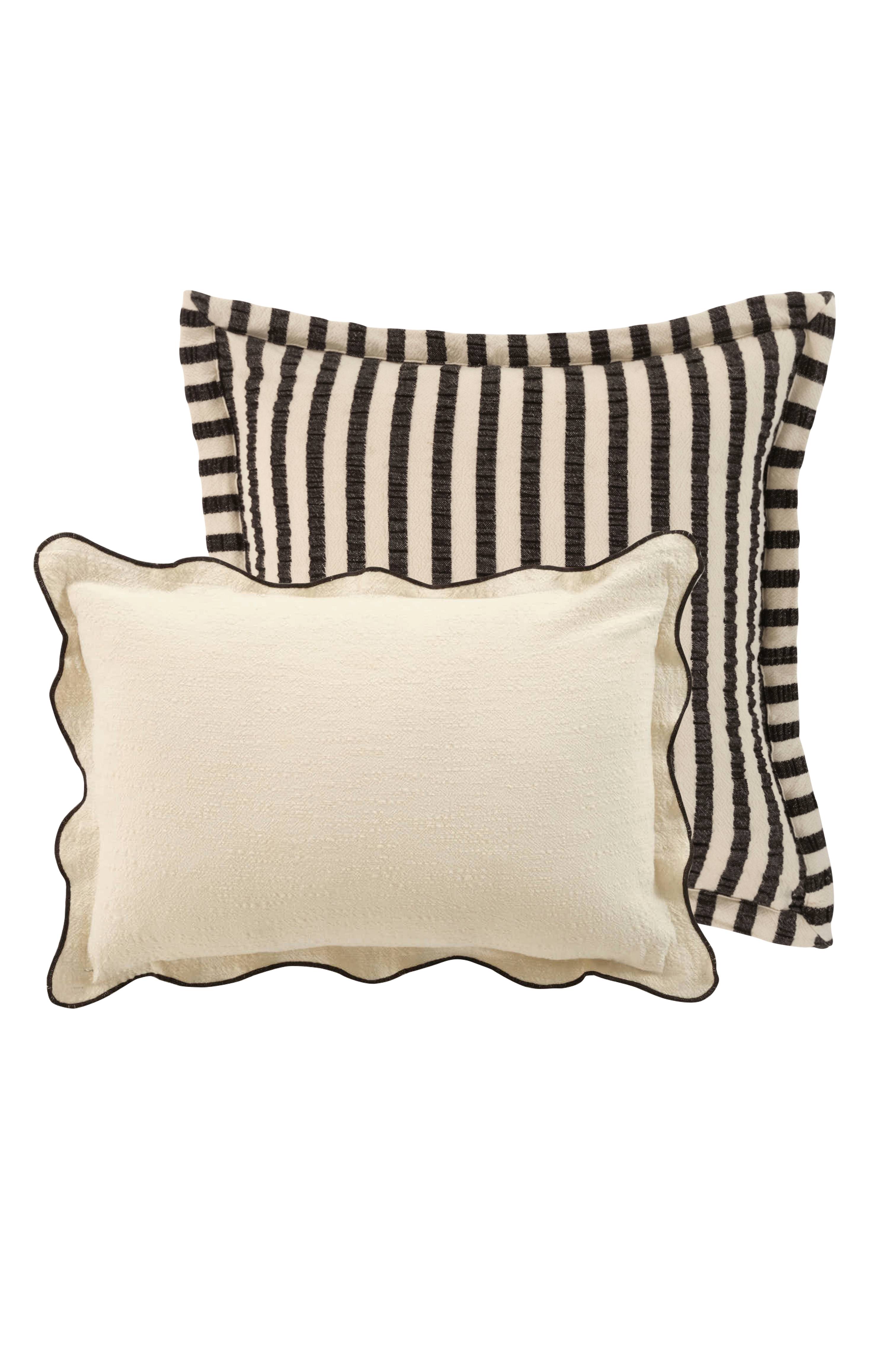 Kuddfodralssetet WENDY tillför charm till alla interiörer. Det ena överdraget har eleganta ränder med en vingdetalj, medan det andra har en vågig kant och kontrasterande finish. Perfekt för att ge djup och karaktär till moderna vardagsrum.