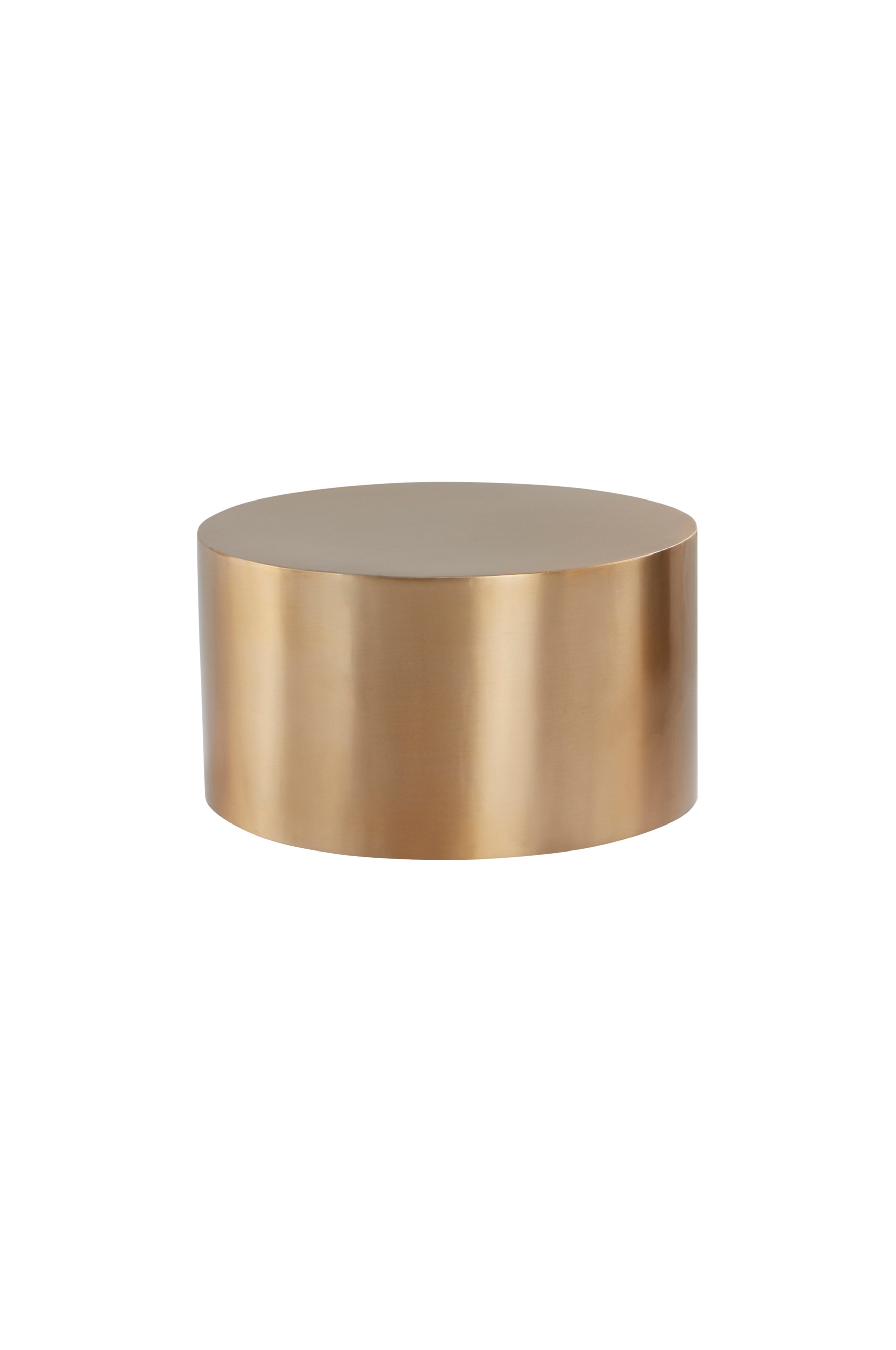 Runt soffbord av järn. Snyggt cylinderformat och ihåligt, med en liten kant nedtill som signalerar avslut. Det guldfärgade har en fin plätering. Det svarta bordet är pulverlackerat med matt yta. Stilrent och behändigt i formatet.