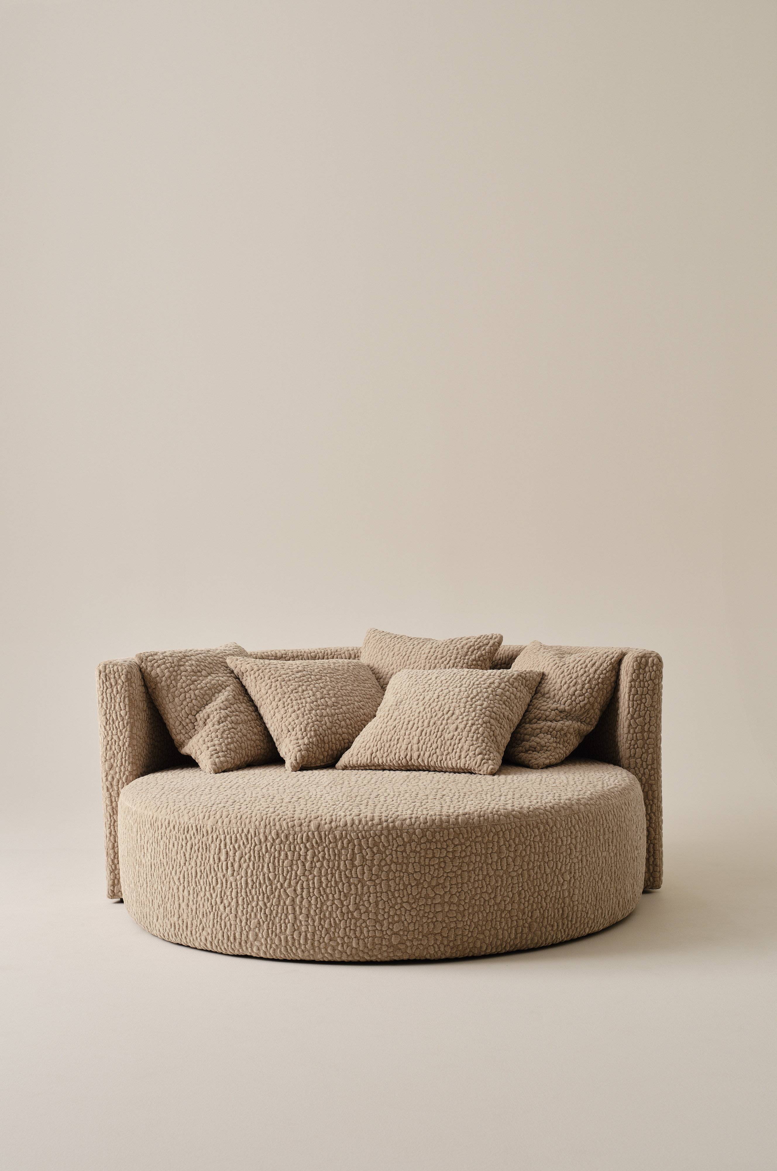 WYOMING soffa för två personer ger en mysig känsla i vardagsrummet eller sovrummet med sin inbjudande runda design. Med skum, sicksackfjädring och elastiskt bandstöd garanterar den bekväma sittplatser. Fem ryggkuddar fyllda med fjäder och polyester ger extra komfort. Kuddfodralen är avtagbara för enkelt underhåll. Yttertyget är inte avtagbart.