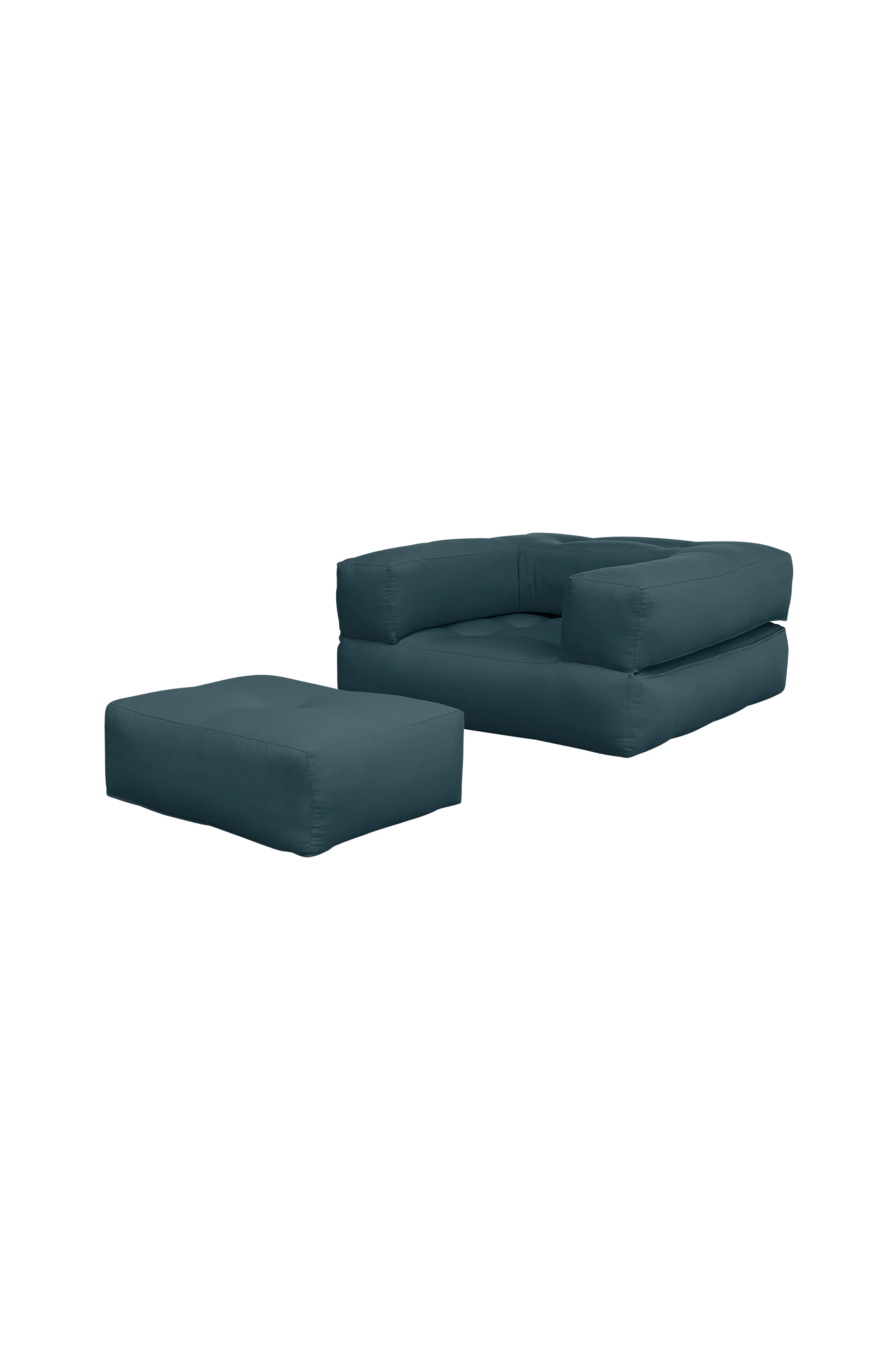 Don't . Be . Square - Det finns inget kvadratiskt med Cube. Med bara en vändning förvandlas Cube enkelt till totalt tre former. En låg fåtölj med en matchande hassock, en bekväm madrass för gäster över natten eller en hög sittpuff. Design av Joseph Willet för Karup Design.