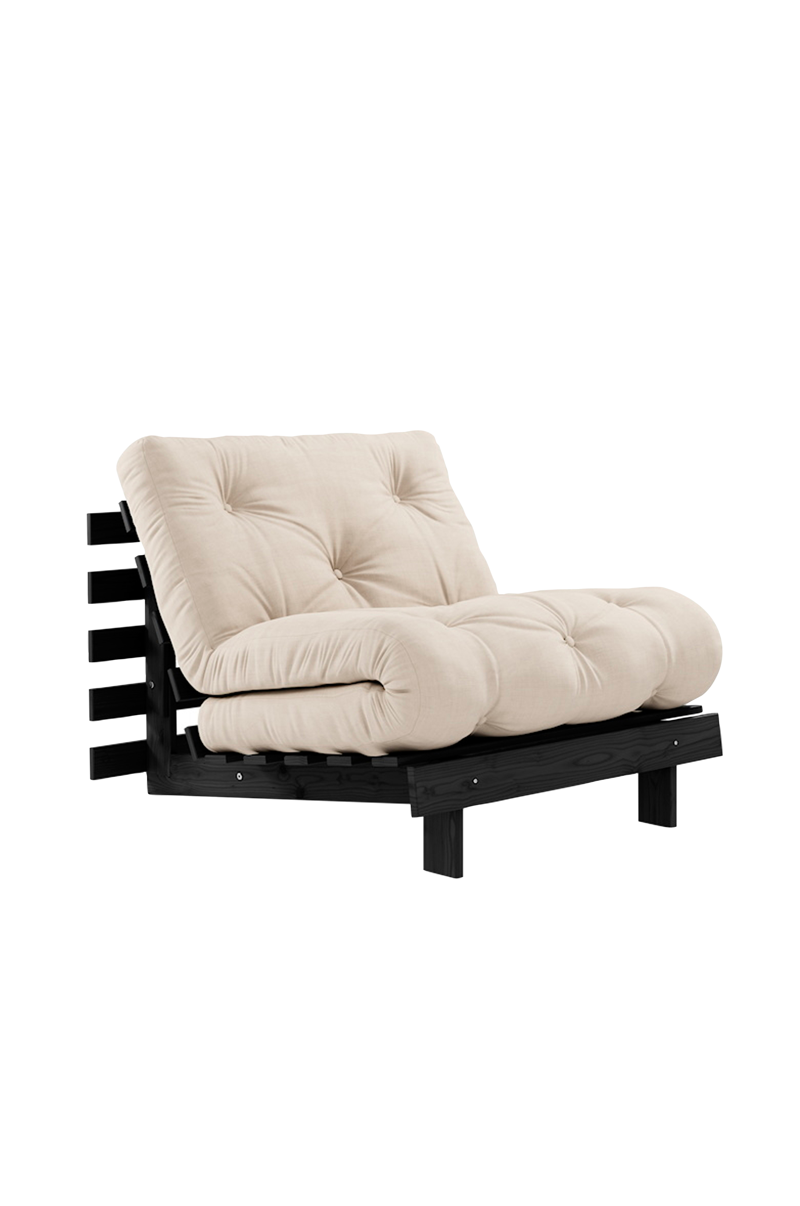 A Timeless Piece - roots 90 är kärnan i karups designdna: här får du inte bara en soffa utan också en säng och en bekväm fåtölj. Genom att lägga ner frambenen och justera ryggstödet får du en skön fåtölj. Genom att sänka ner ryggen helt får du en skön säng där du kan ladda upp med rötterna i marken. Fördubbla ryggen, fäll över madrassen och nu har du en fåtölj i normalhöjd. Roots 90 förvandlas snabbt och enkelt - precis som magi. Förstår du vad jag menar? Observera att alla våra futonprodukter är handgjorda, så du kan märka små skillnader i storlek och vikt.