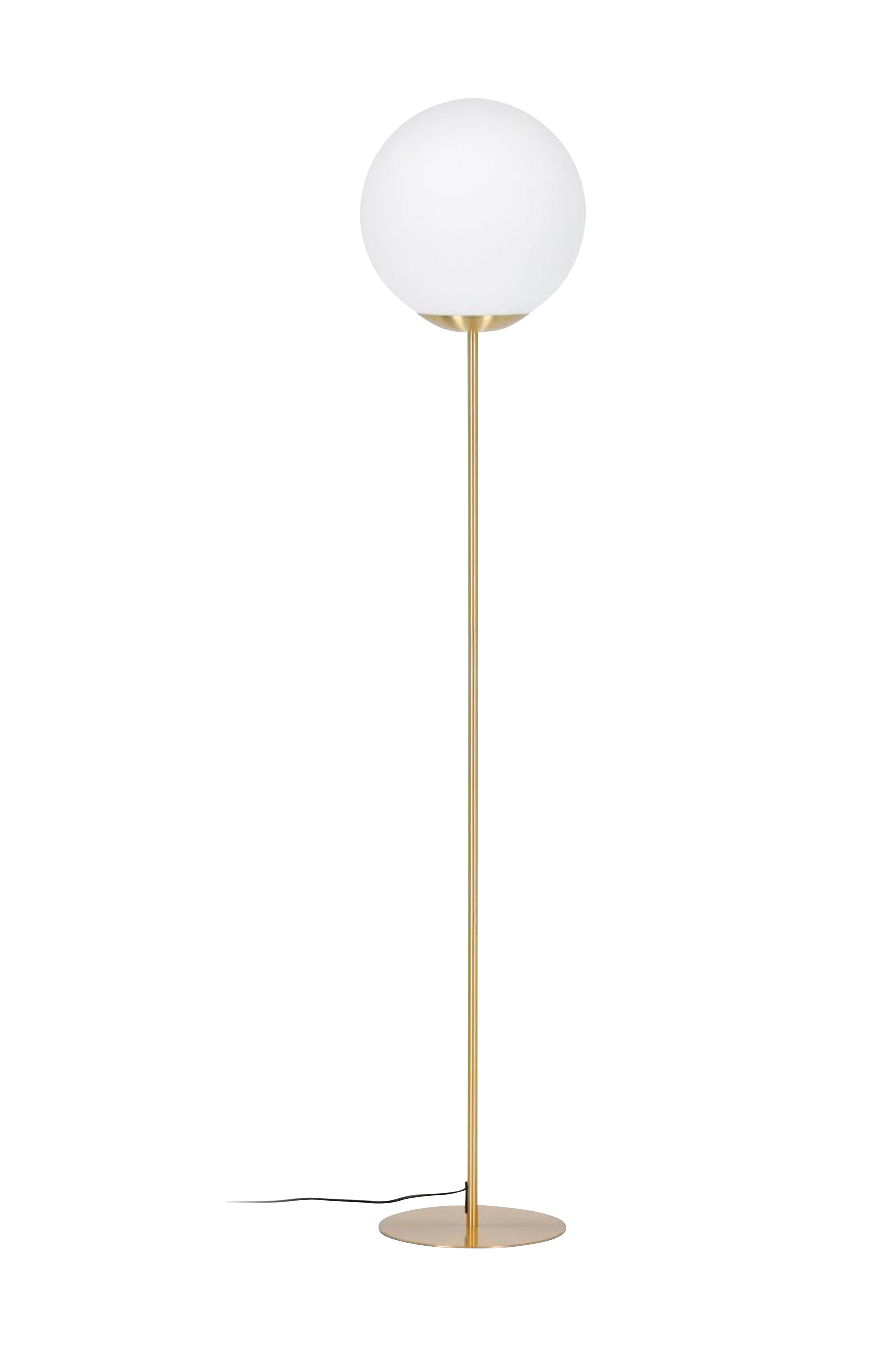Denna klotformade lampa är allt du behöver om du älskar modern design och geometriska former. Lampan med glas och stålstomme med pläterad mässing kommer att ge ditt vardagsrum en riktigt snygg stil. Diameter 30 cm och höjd 150 cm. Lampfotens mått är 25 cm i diameter. Avstånd mellan lampa och strömbrytare är 50 cm.