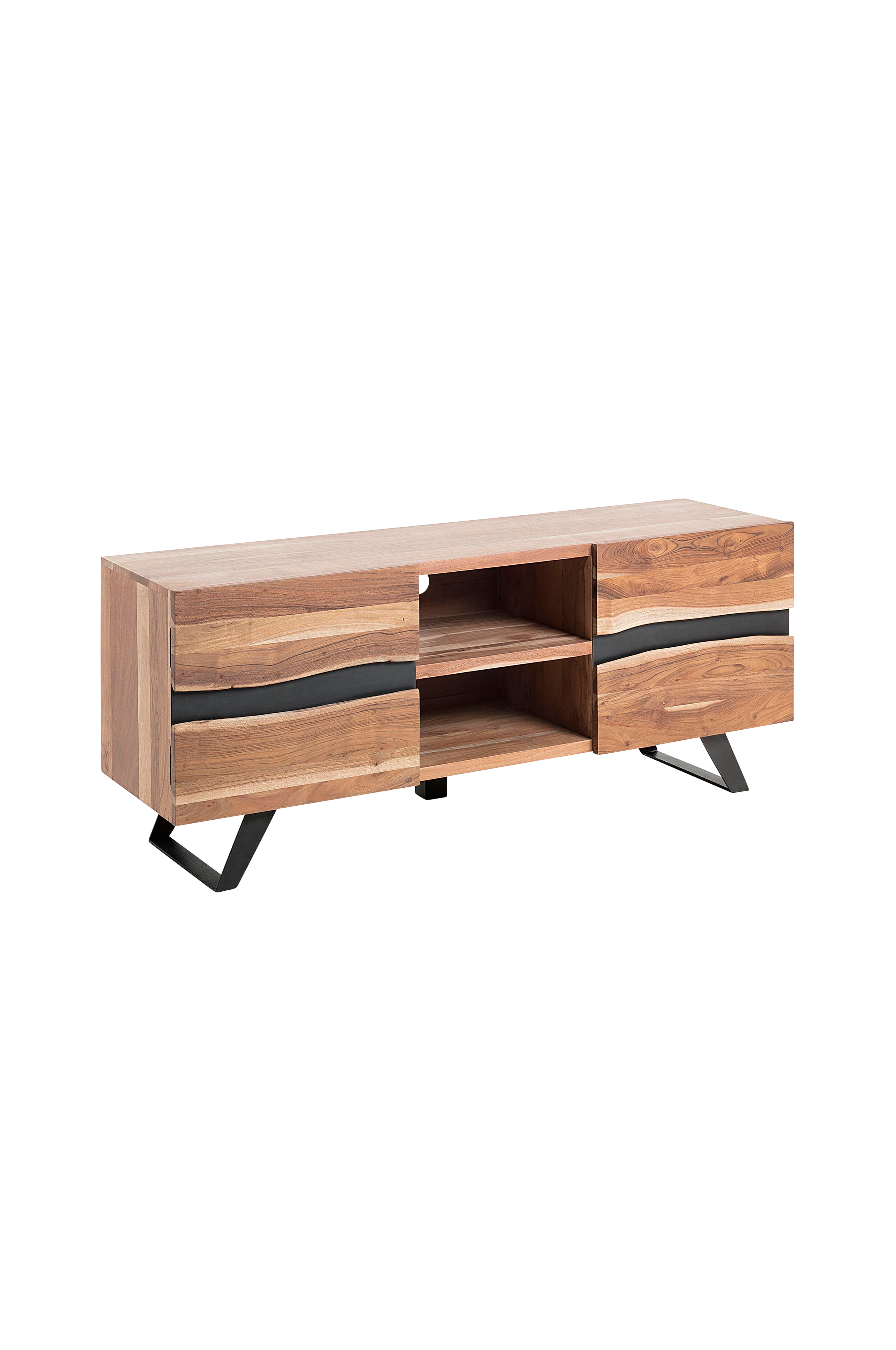 TV-bänk av massivt akaciaträ med ben och detaljer på dörrar av metall. Bredd: 160 cm. Djup: 43 cm. Höjd: 65 cm.