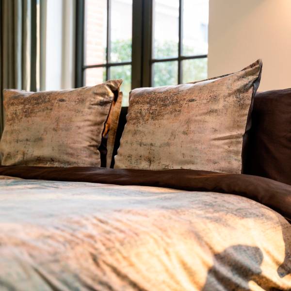 Påslakanet ehime har den där mystiska looken som är trendig just nu. Lakanet kombinerar olika nyanser som påminner om en sliten yta eller en abstrakt målning. Denna design har ett coolt utseende, perfekt som ett blickfång i en industriell interiör. Baksidan av påslakanet är enfärgad. Påslakanet ehime är tillverkat av 100% tencel, ett extremt starkt och otoligt mjukt tyg. Tygets unika egenskaper är dess ventilerande förmåga, varmt på vintern ovh svalt på sommaren. Bäddset bestående av två örngott och ett påslakan .