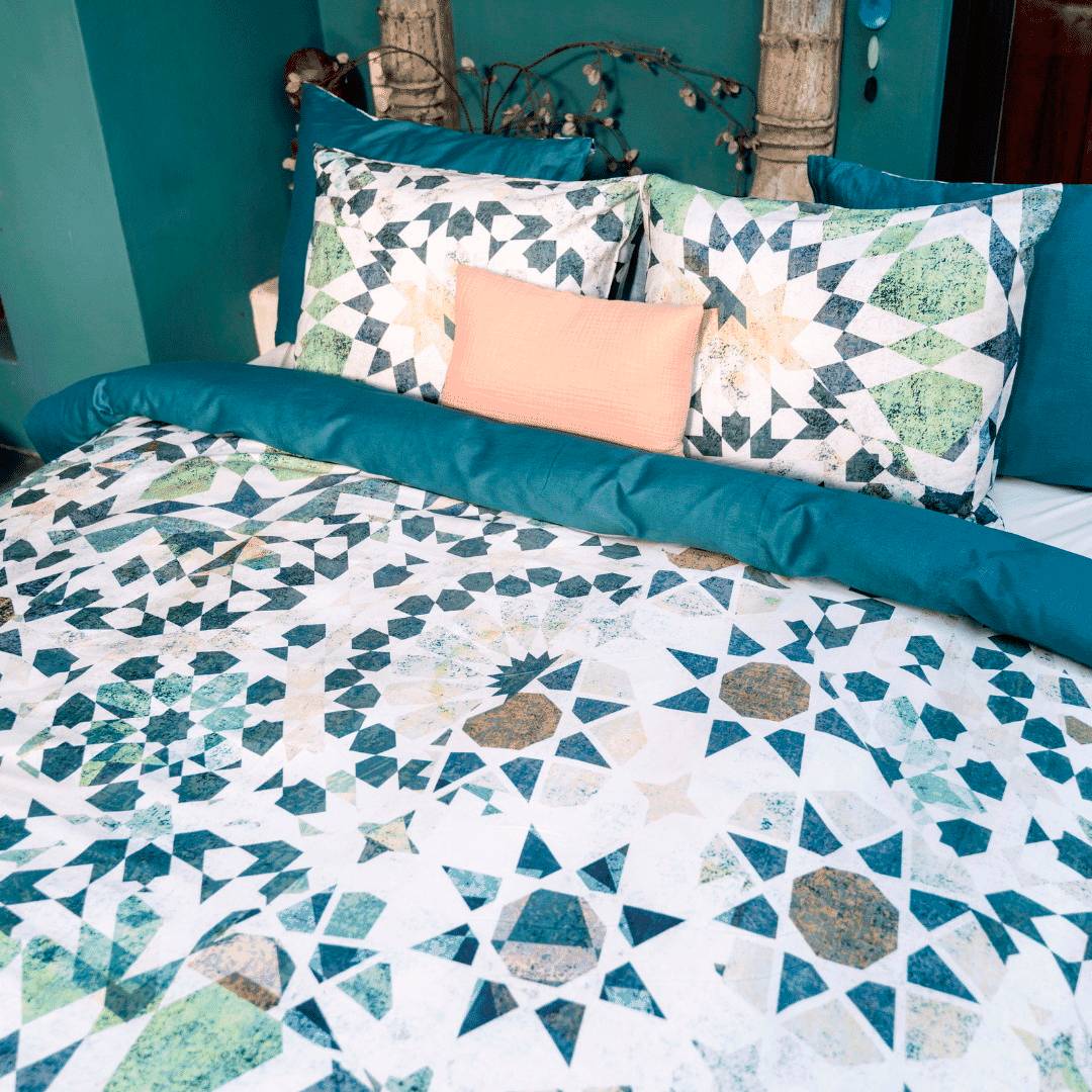 Påslakanet faiz är inspirerat av hantverket med marockanska kakelplattor. Påslakanet faiz har fantastiska detaljer. Trycket ligger som en mosaik över påslakanet. Baksidan av påslakanet är enfärgad. Påslakanet faiz är tillverkat av 100% ren organisk bomullssatin, gots- cerifierat. Supermjukt, med en lyxig glans. Bäddset bestående av ett örngott och ett påslakan med en trådtäthet på 200tc.