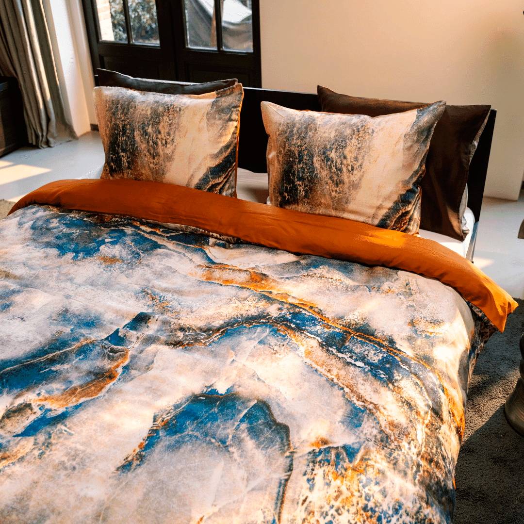 Påslakanet reeva är en kraftfull design med inspiration av natursten, vilket tydligt återspeglas i de vackra brytlinjerna i designen. Den speciella färgkombinationen ger ett unikt utseende. Baksidan av lakanet är enfärgat. Påslakanet reeva är tillverkat av 100% tencel, ett extremt starkt och otoligt mjukt tyg. Tygets unika egenskaper är dess ventilerande förmåga, varmt på vintern ovh svalt på sommaren. Bäddset bestående av två örngott och ett påslakan .