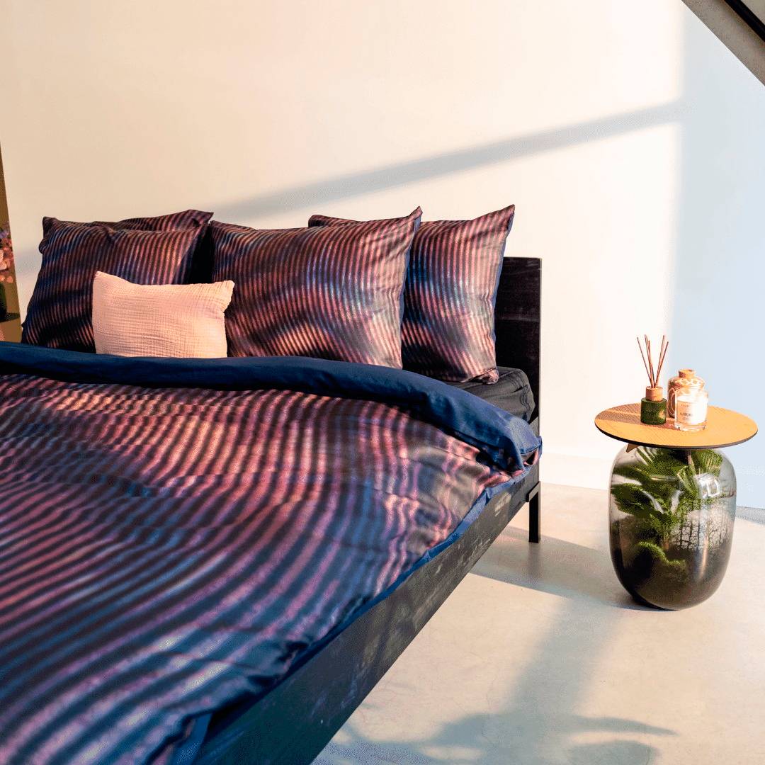 Påslakanet utano är en speciell design med en futuristisk touch. Detta lakan kombinerar två linjer, vilket skapar en design som ser ut att vara i rörelse. De vackra djupa färgerna fullbordar helheten. Baksidan av denna design är enfärgad. Påslakanet utano är tillverkat av 100% ren organisk bomullssatin, gots- cerifierat. Supermjukt, med en lyxig glans. Bäddset bestående av två örngott och ett påslakan med en trådtäthet på 300tc.