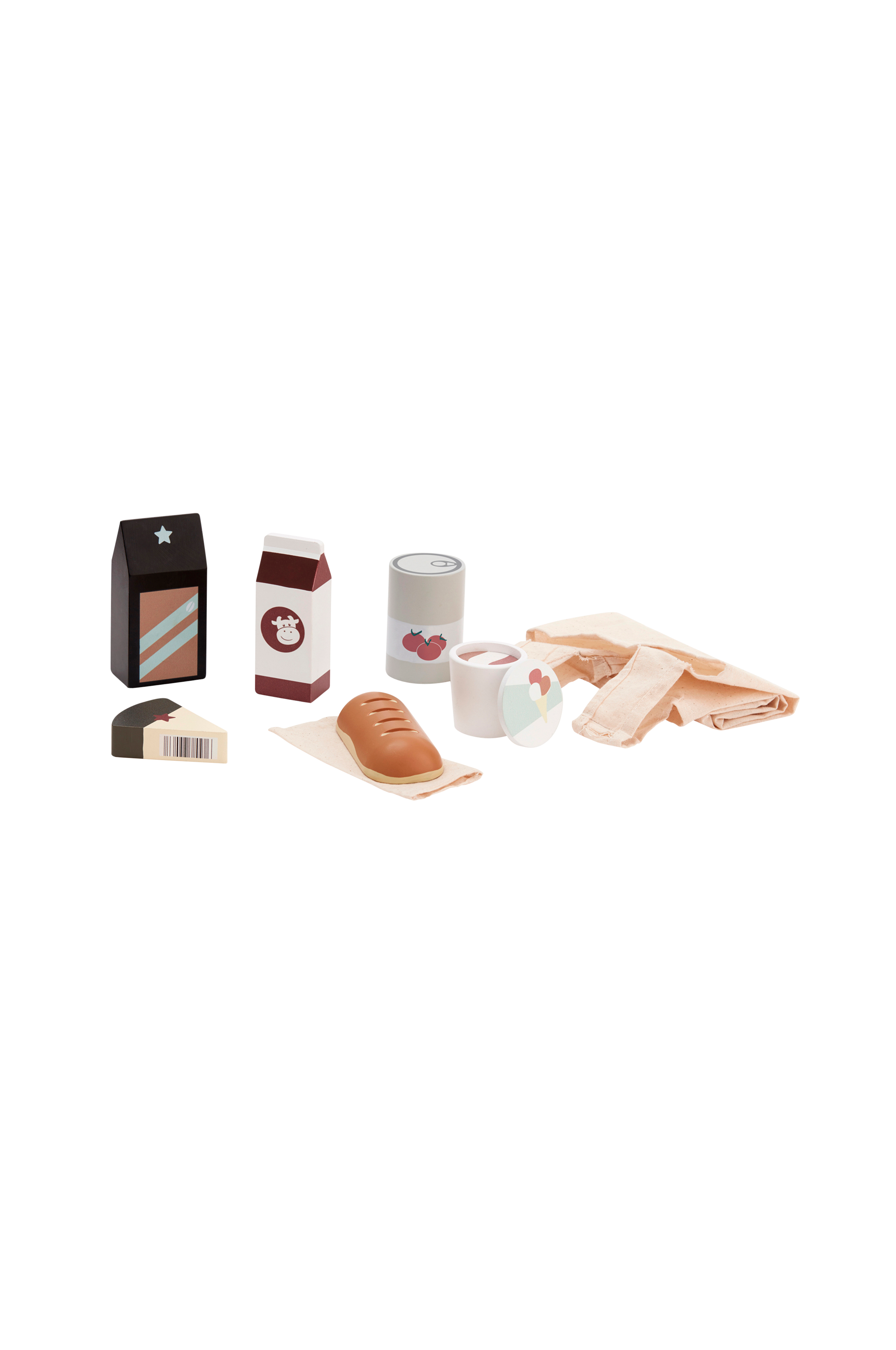 Innehåller kaffe, ost, mjölk, glass, sylt, burktomater, bröd och brödpåse i bomull. Sätt upp varorna i affären, betala i Kid's kassapparat och komplettera med andra produkter i Kid's Bistro serien.