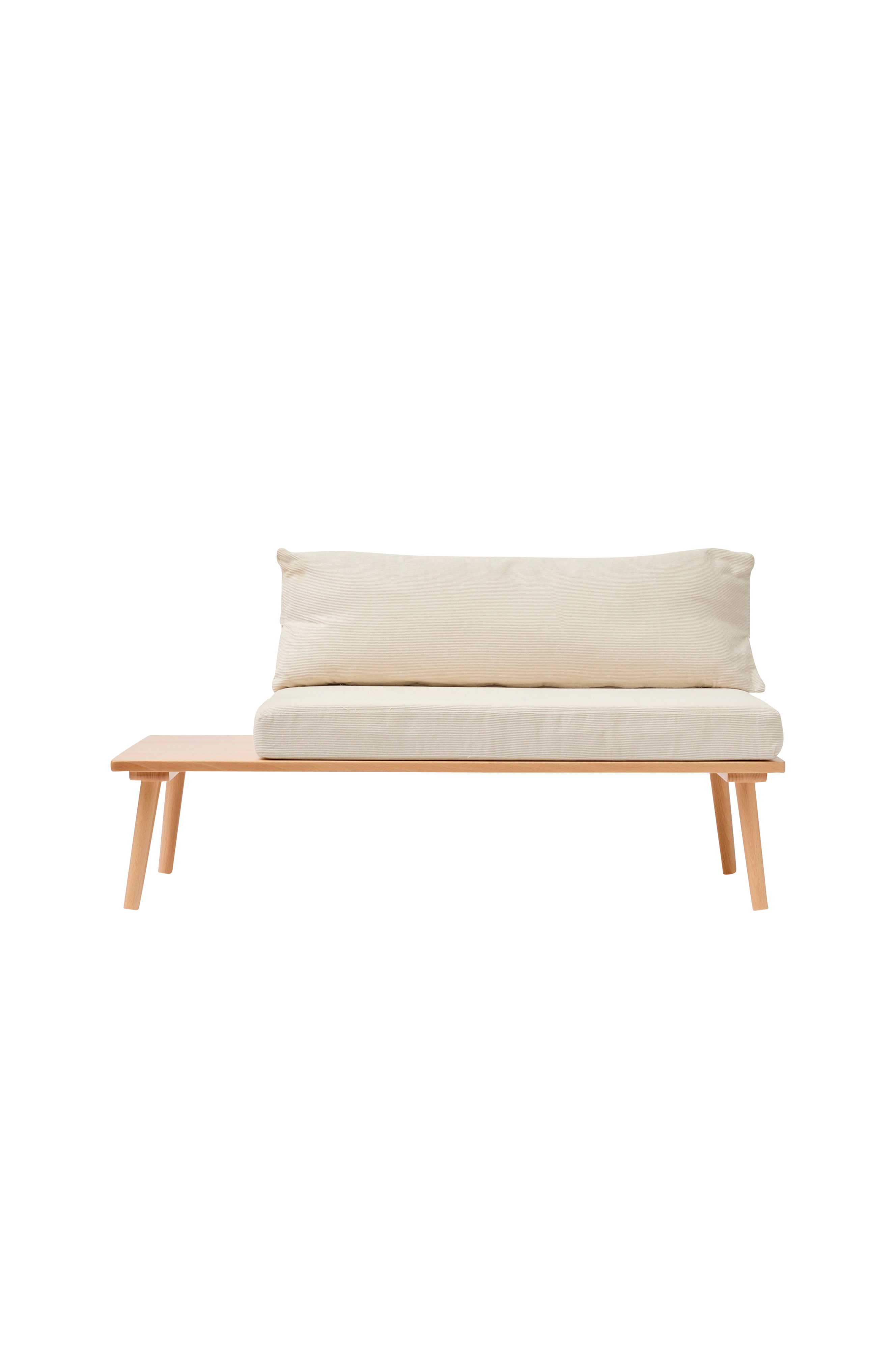 En låg loungesoffa med integrerat sidobord. En mysig plats för läsning och vila. Tillverkad i FSC certifierat trä av ljus bok. Kuddöverdrag i manchester i 100% bomull är avtagbart, vänd det ut och in och tvätta i tvättmaskin 30 grader.