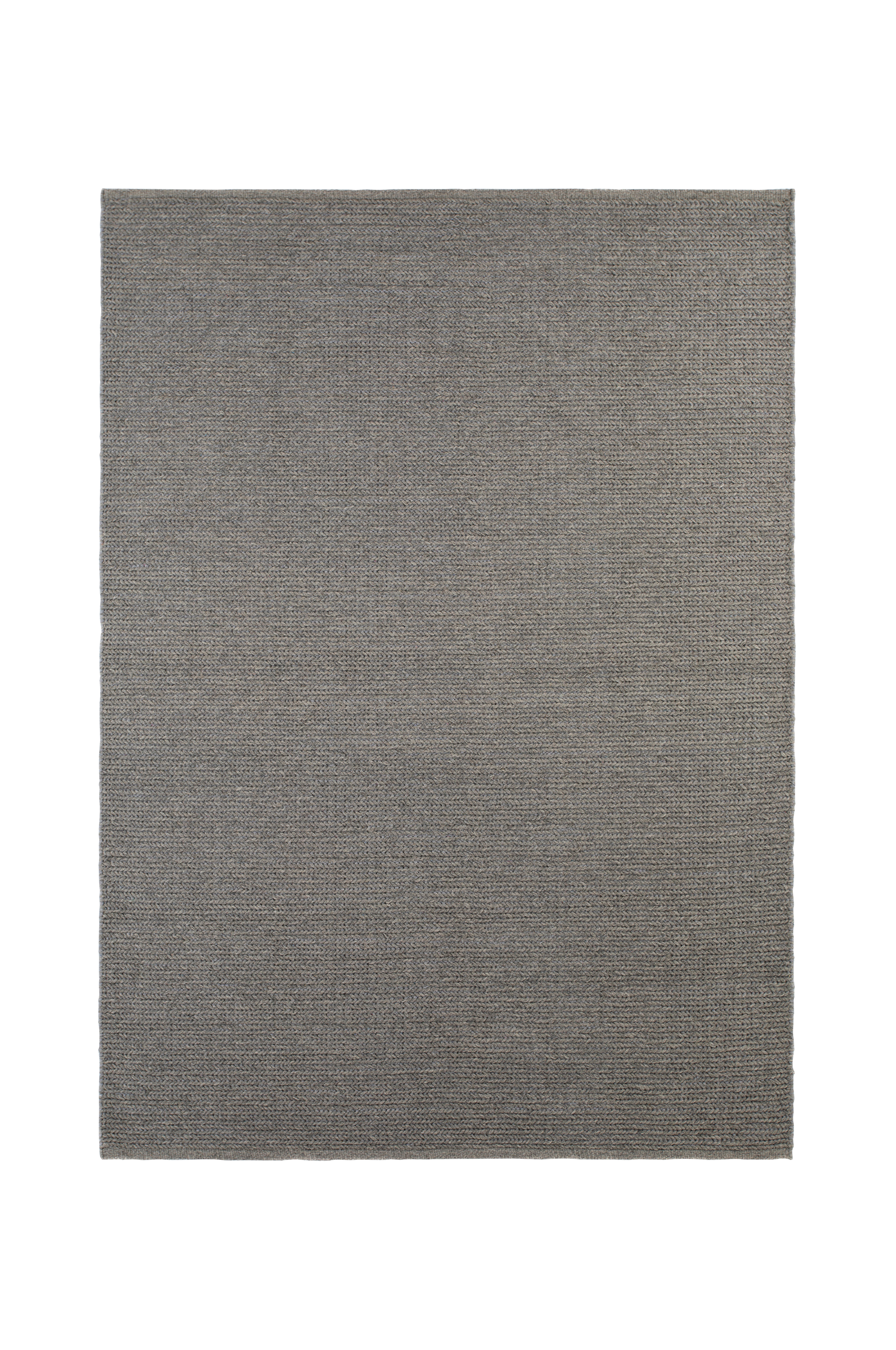 Mörkbrun matta som ser lite gråare ut än jag skulle vilja. Trevligt och varmt under soffgruppen. Ligger lite ”lös” på det släta golvet, men soffan och bordet håller det på plats. Fint vävd.