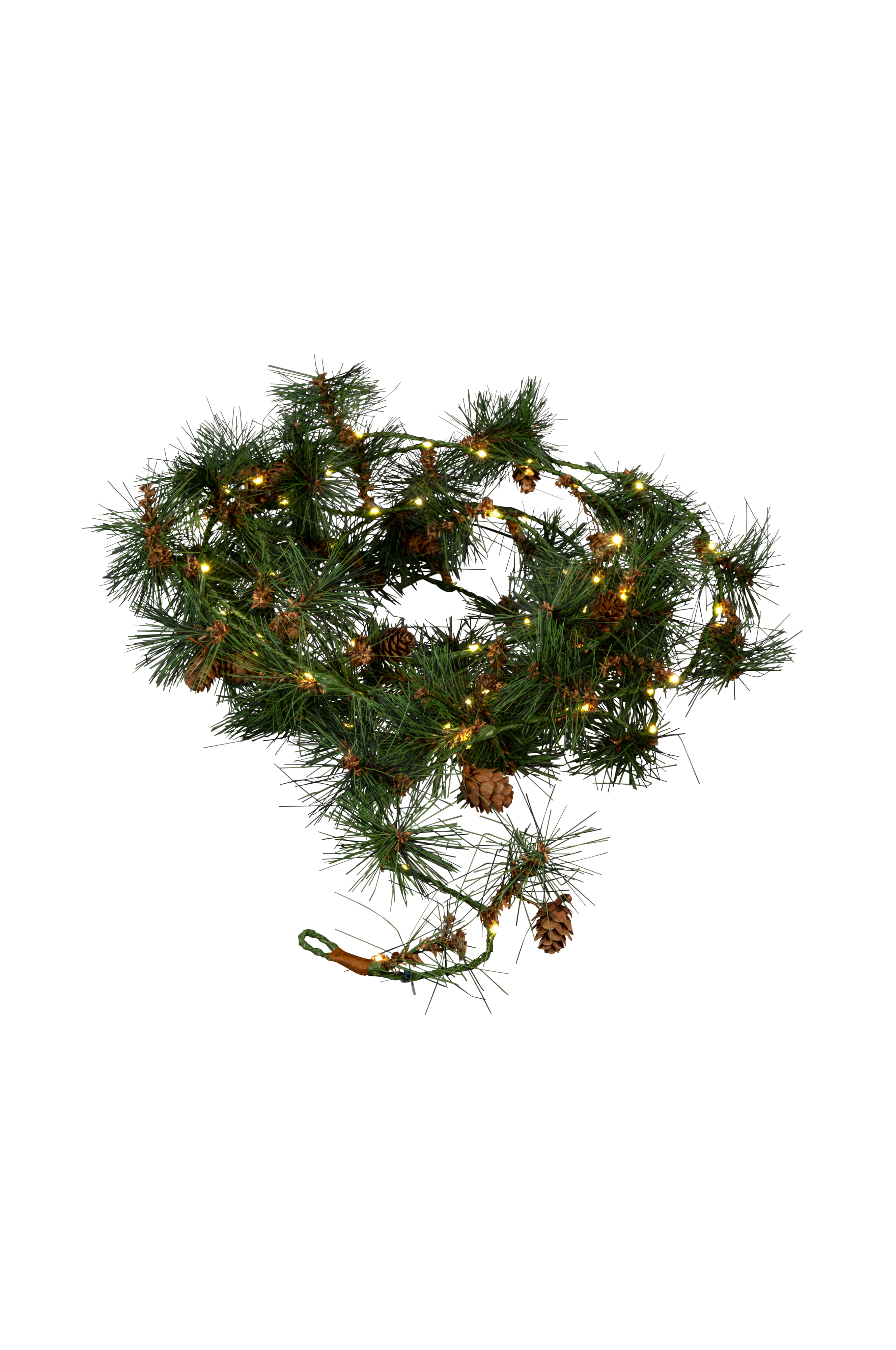 Denna vackra girlang med tallbarr och små kottar avger ett varmt, stämningsfullt ljus med sina 60 varmvita led-lampor. Perfekt för att skapa en magisk vinterkänsla både inomhus och utomhus. Girlandans naturliga design och praktiska 6-timmars timer gör den till en elegant och enkel detalj som förhöjer vinter- och juldekorationer.