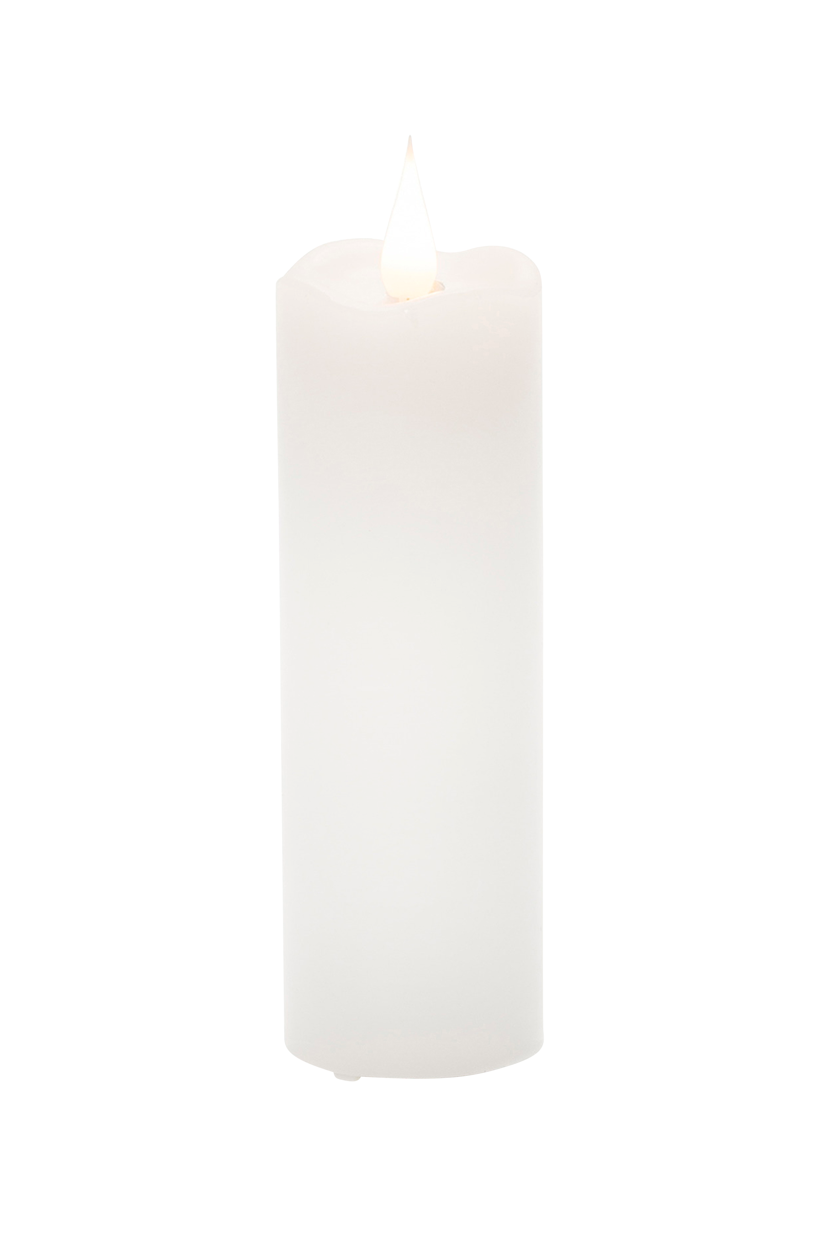 White living light vaxljus med varmvit led- och 3d-flamma är ett realistiskt elektriskt pelarljus. Det har en praktisk timer med 4- och 8-timmarsinställningar, perfekt för vintermörkret. Led-ljuset mäter 5x15,2 cm och drivs med 2xaa-batterier (ingår ej). Brinntiden vid batteridrift är ca 300 timmar.