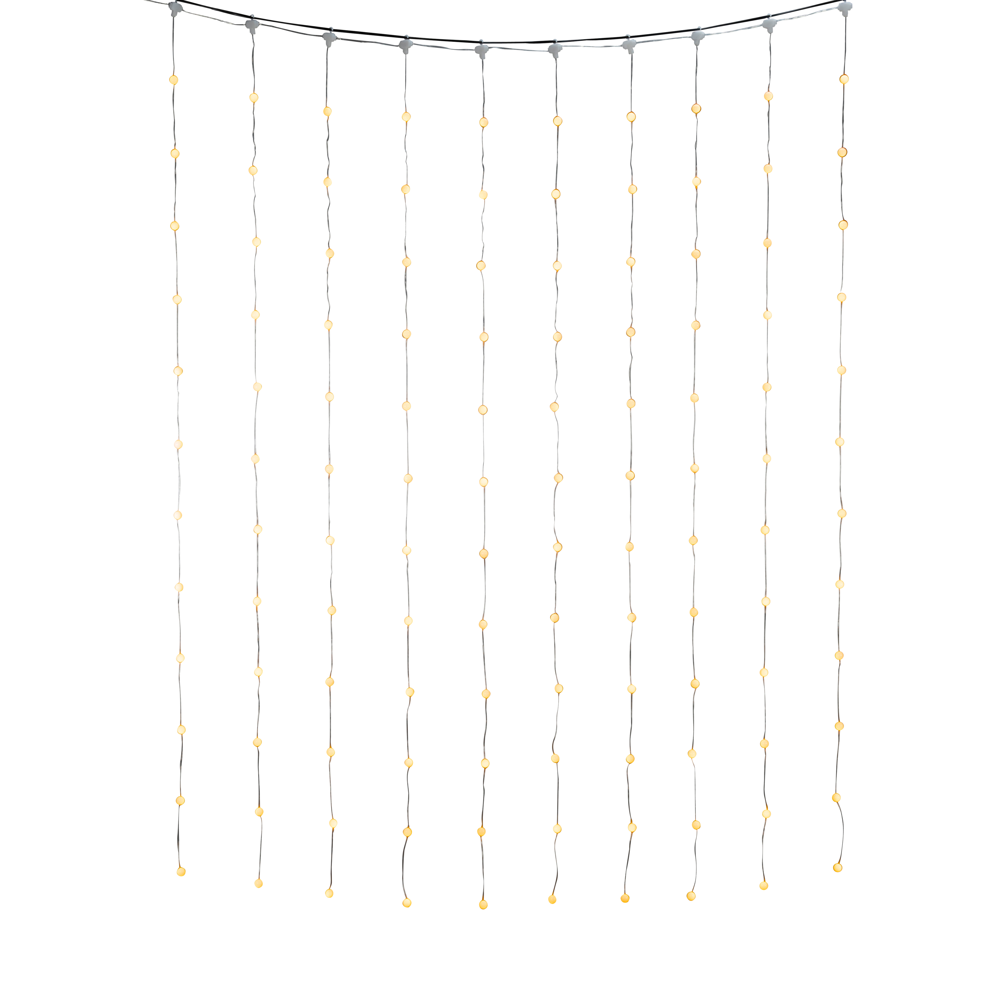 Bollar på ett snöre. Atmosfärisk usb-driven ljusridå med 120 bärnstensfärgade, frostade lysdioder i form av vita bollar och transparent kabel. Lampavstånd 12,5 cm, längd 6 m.