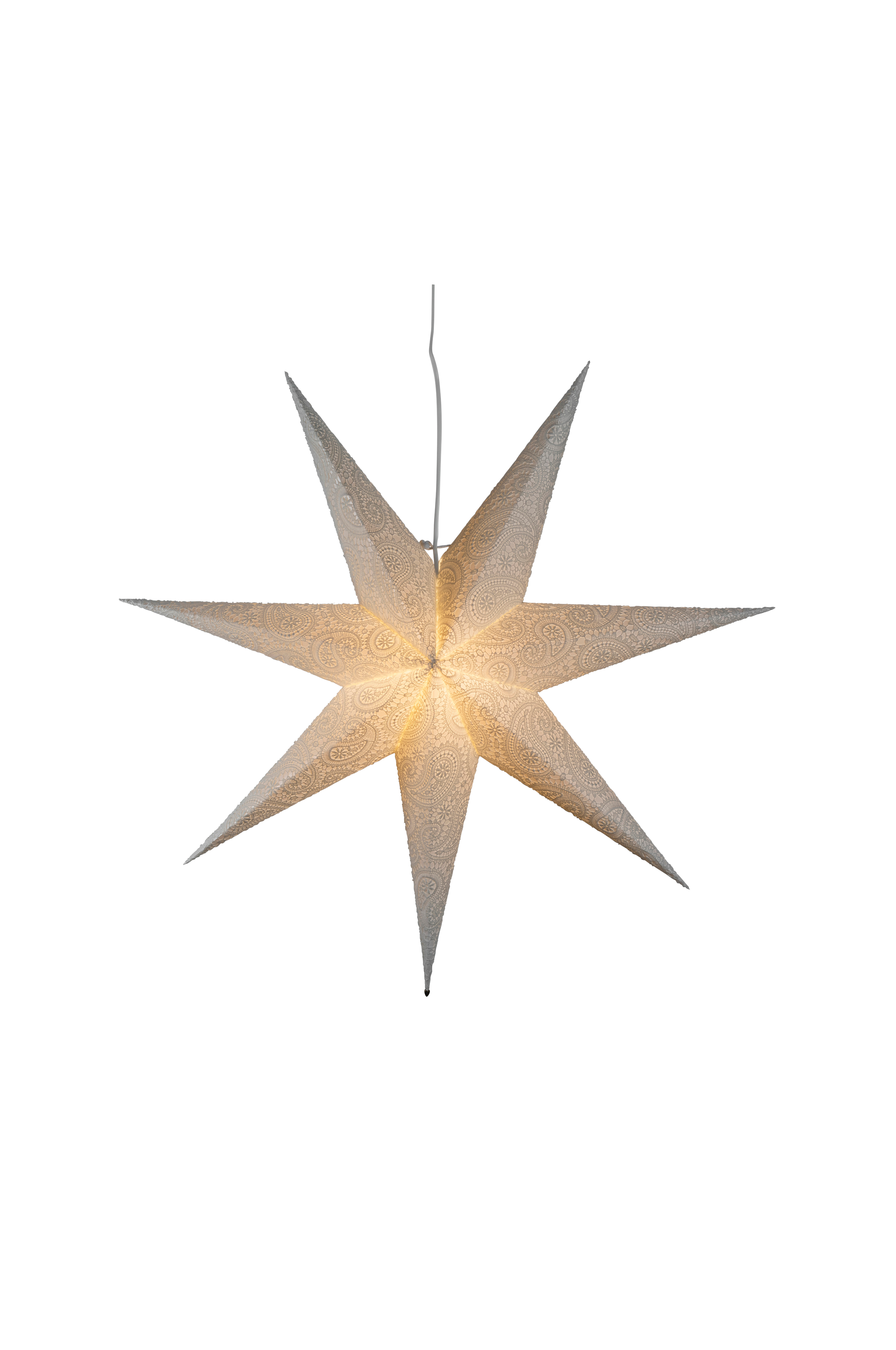 Vit spetsmönstrad pappersstjärna som ger en personlig touch. 500 cm anslutningskabel med strömbrytare ingår. E14-sockel. Stjärnan har 7 punkter och en diameter på 60 cm. Endast för inomhusbruk.