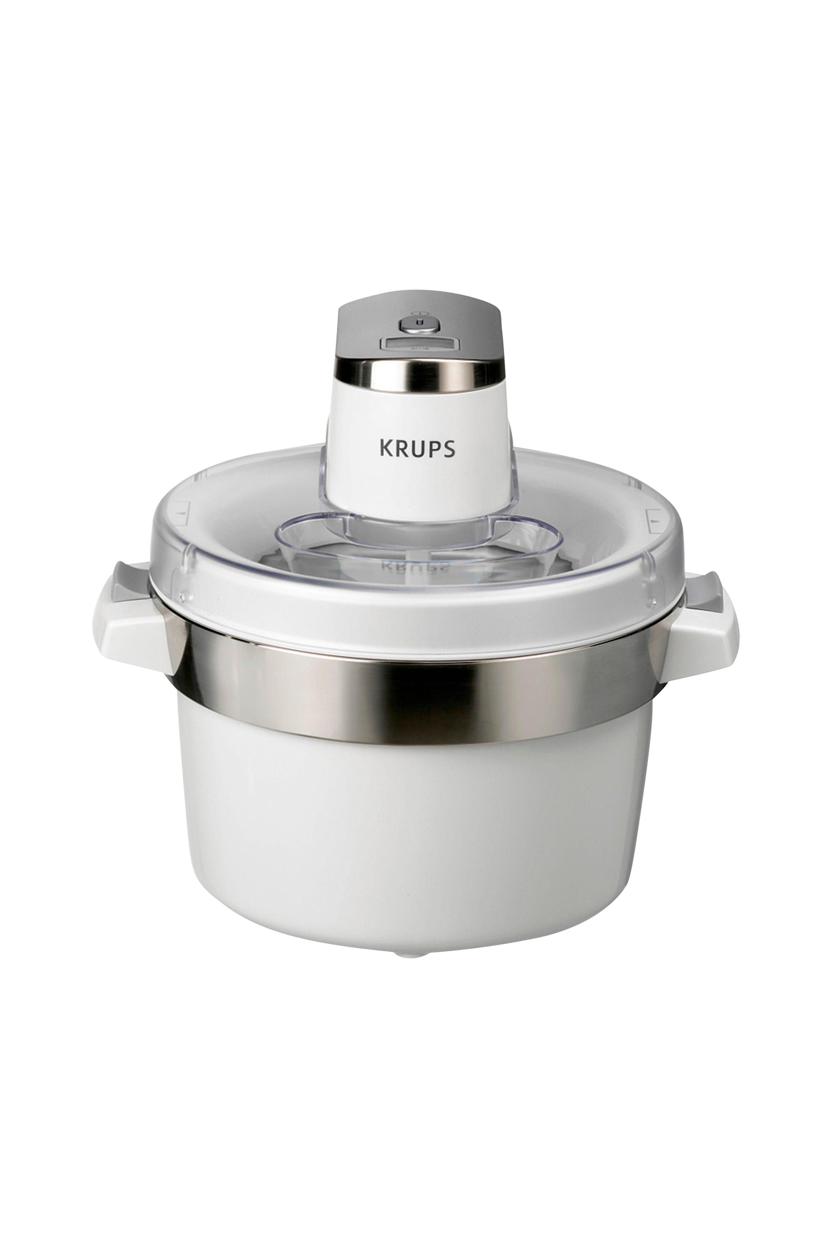 Lättavläslig skärm med blå bakgrundsfärg i samma stil som Krups övriga produkter. Glassmaskinen piper och stängs av automatiskt när glassen är färdig. Omrörningen avstannar och maskinen fortsätter att pipa i 10 sekunder.