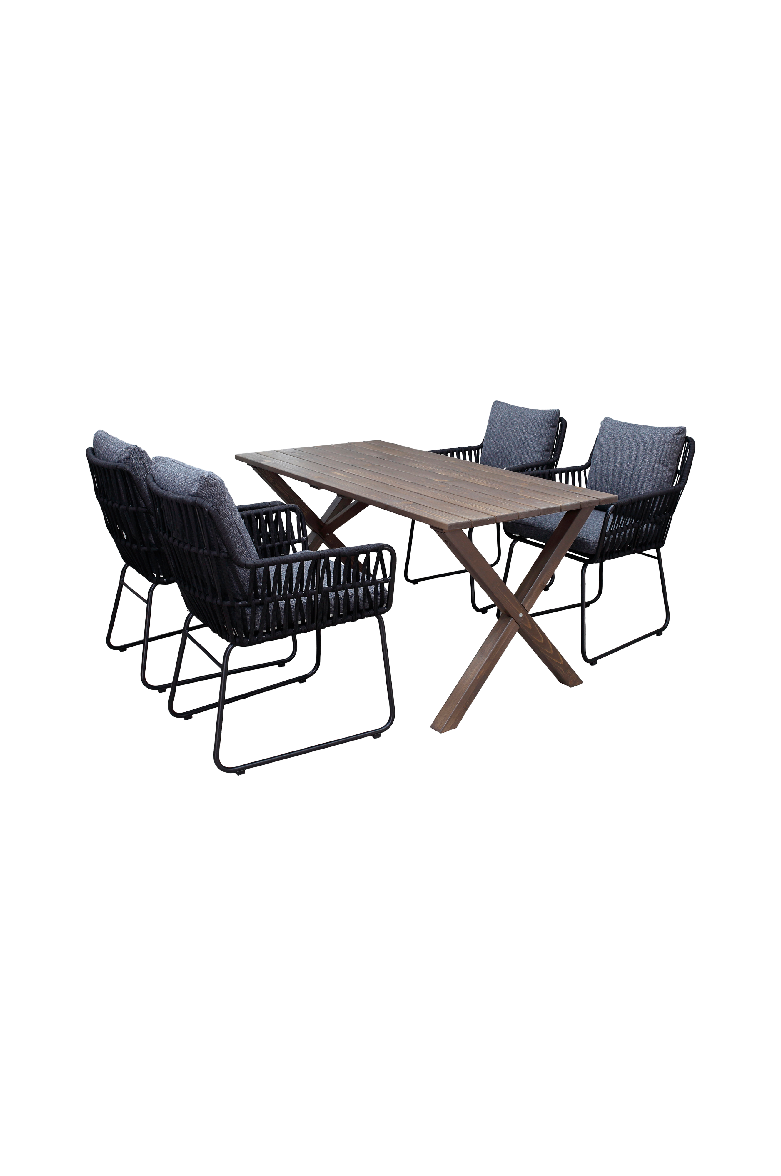 En modernt kombinerad trädgårdsmöbelset med ett rektangulärt bord i massivt trä med korslagda ben och bekväma rymliga fåtöljer i rep. Tillräckligt med plats för 4 personer.