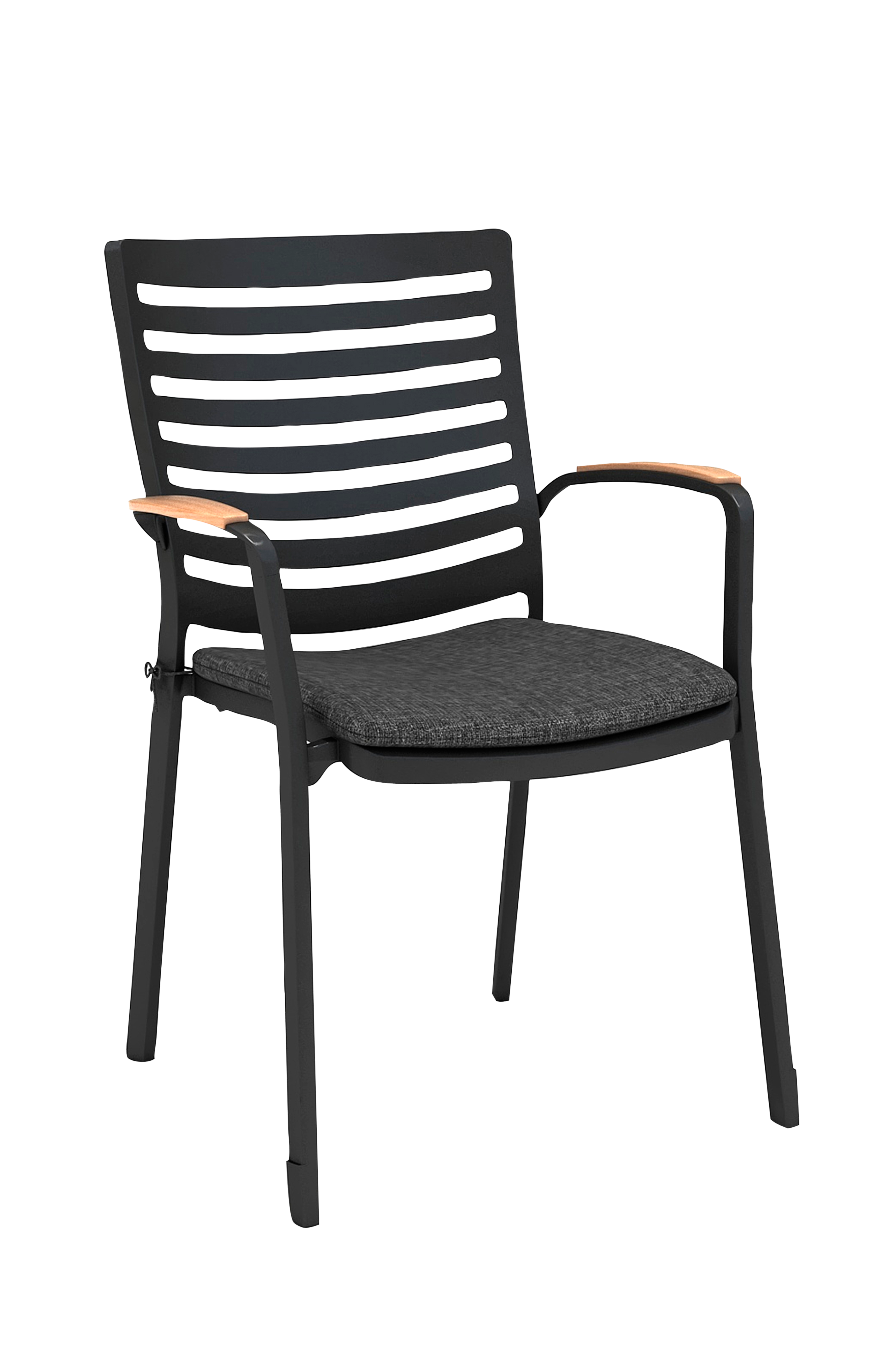 Die Casted Aluminium (solid seat and back). Supreme comfort, sanded finish in black. Extreme Durability combined with Teak FSC armrests. Stacking, cushion included in Olefin 240gr