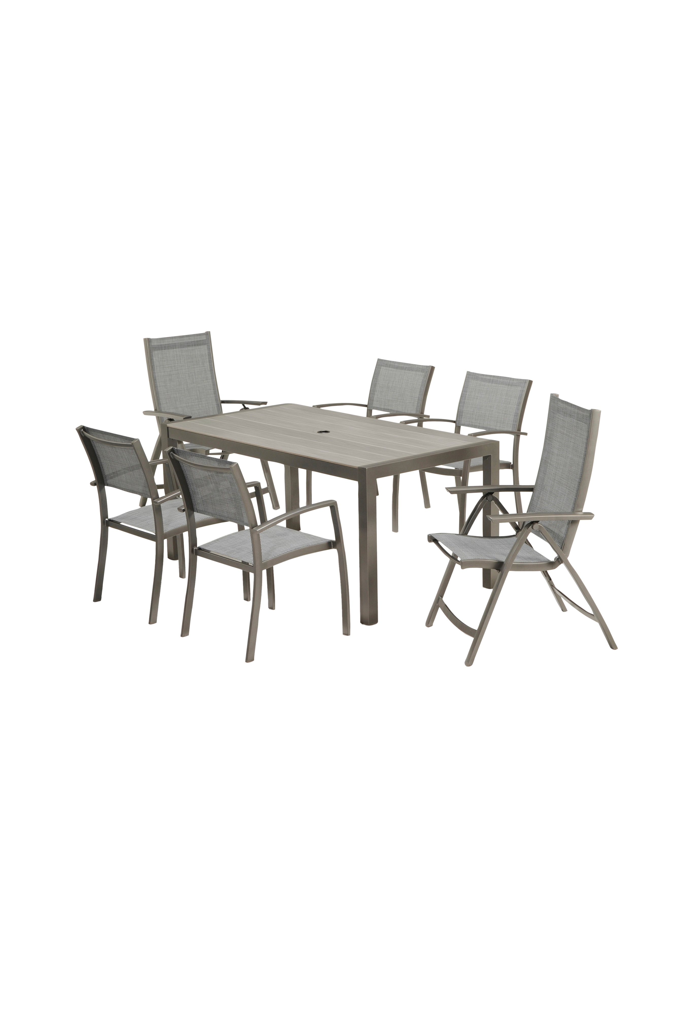 Bekvämt och lättskött set med 4 stapelbara karmstolar och rektangulärt bord 163x88 cm med bordsskiva av duraboard (rep- och fläcktålig) och rostfria stommar av aluminium. 100% underhållsfri. För 4-6 personer.