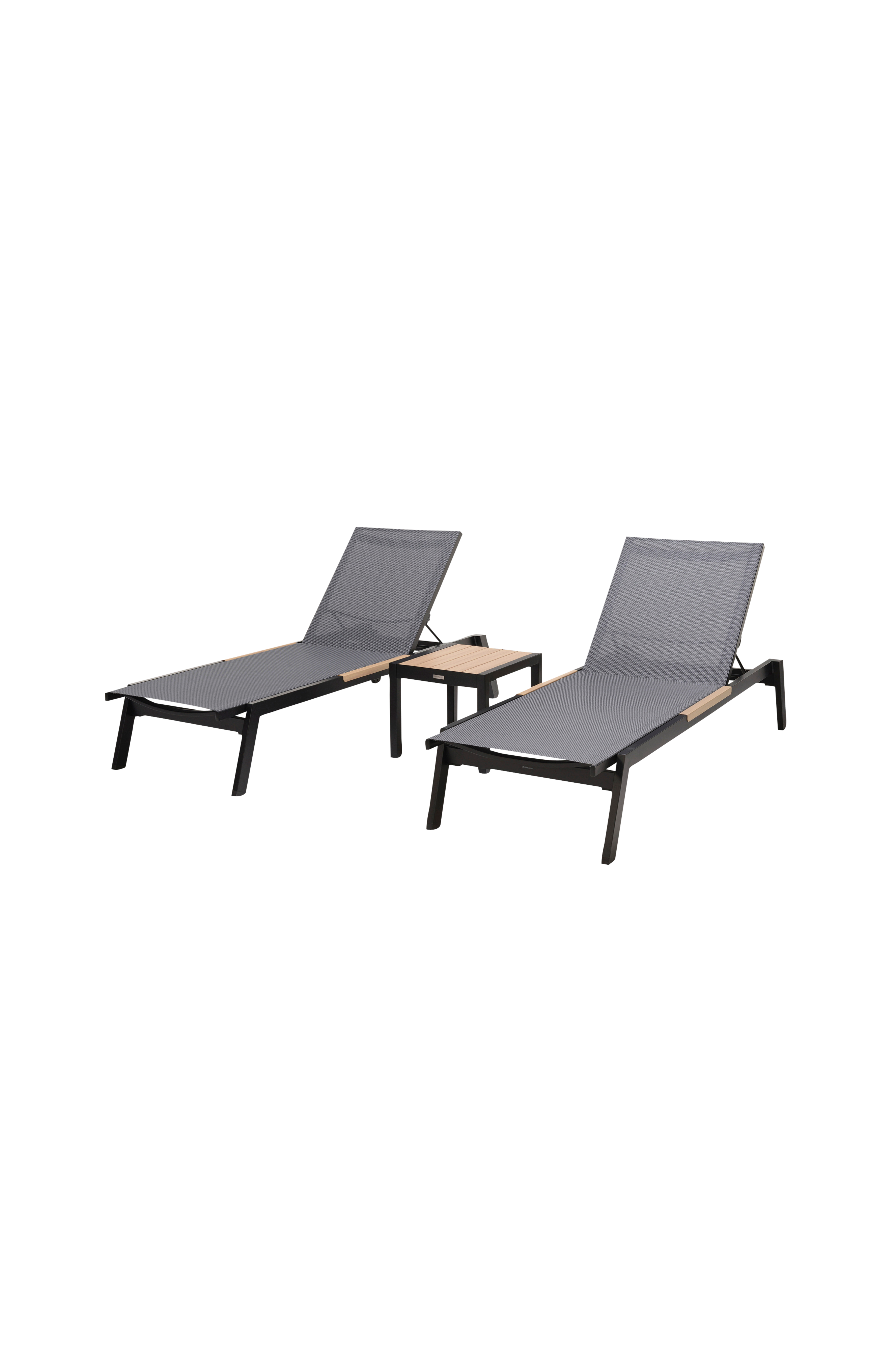 2 stapelbara solbäddar med hjul, av aluminium i svart färg med slipad effekt, armstöd med tryckt träeffekt med ett fyrkantigt sidobord med rostfri stomme av aluminium och bordsskiva av aluminium med tryckt träeffekt. Utmärkt väderbeständighet. 100% underhållsfri.