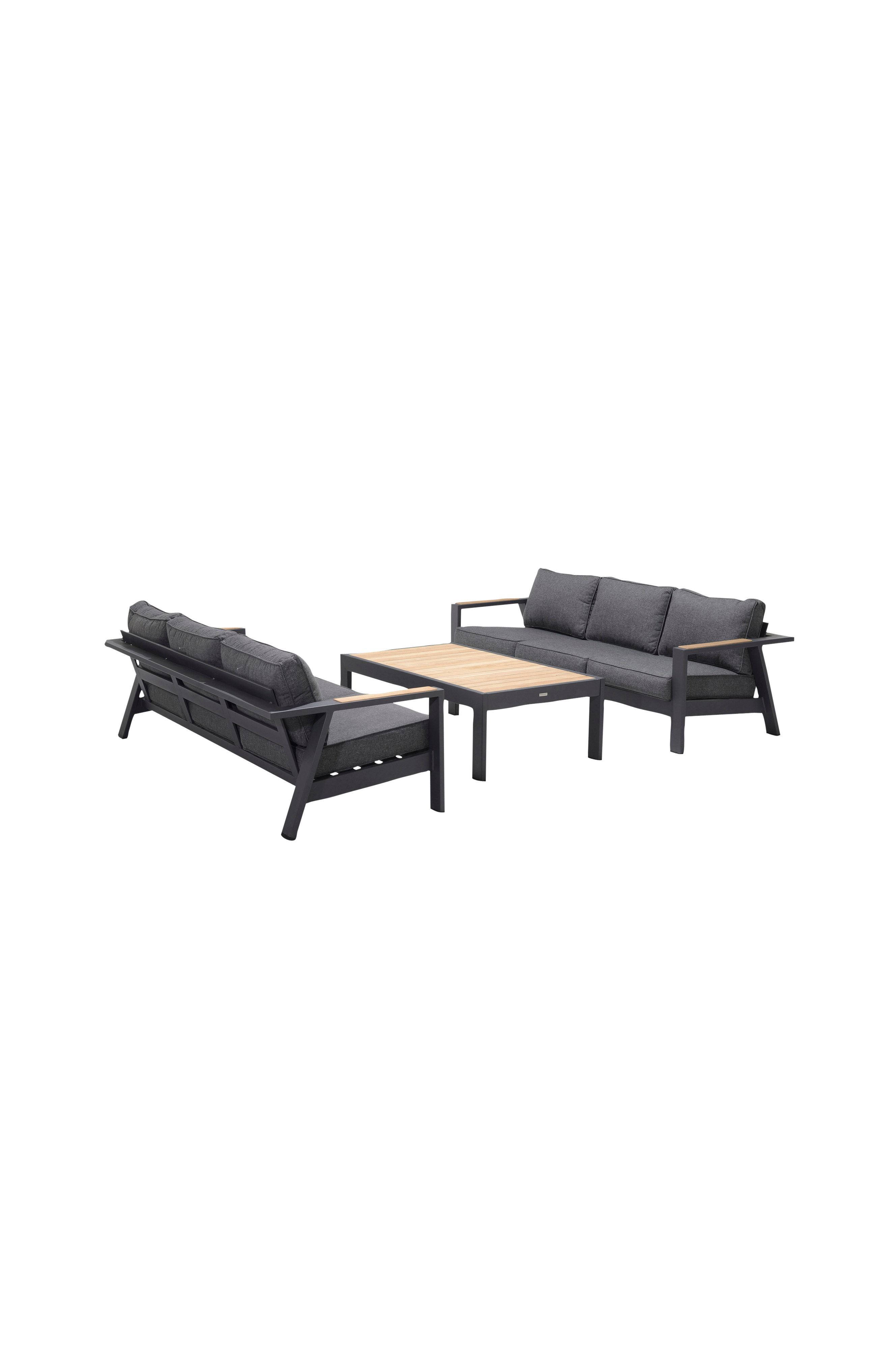 Bekväm soffgrupp för utomhusbruk med två tresitssoffor och ett soffbord. Rostfri, mörkgrå stomme av aluminium med slipad effekt och förstklassiga dynor med klädsel av olefin.