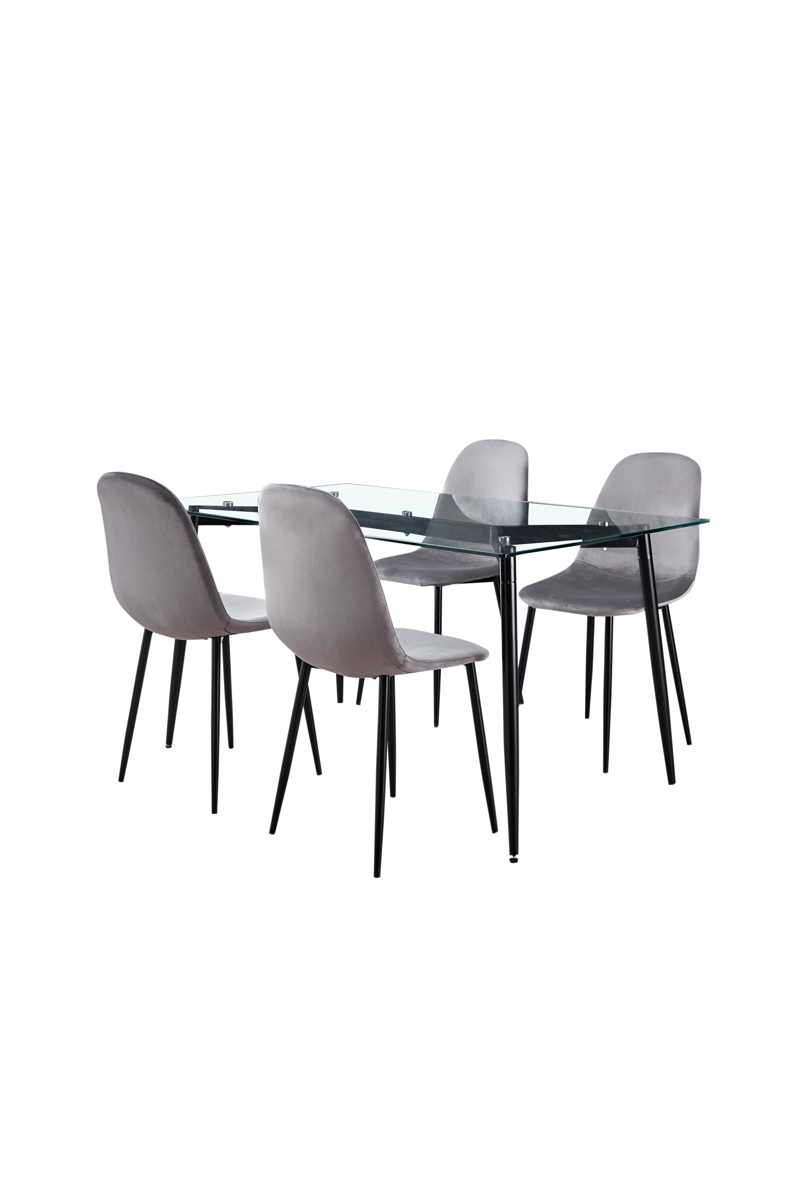 Arezzo är en matsalsmöbel i avskalad, modern stil. Den strama metallstommen ger ett luftigt och lätt intryck som harmonierar väl med bordsskivans glas och stolens stilrena sammetssits.